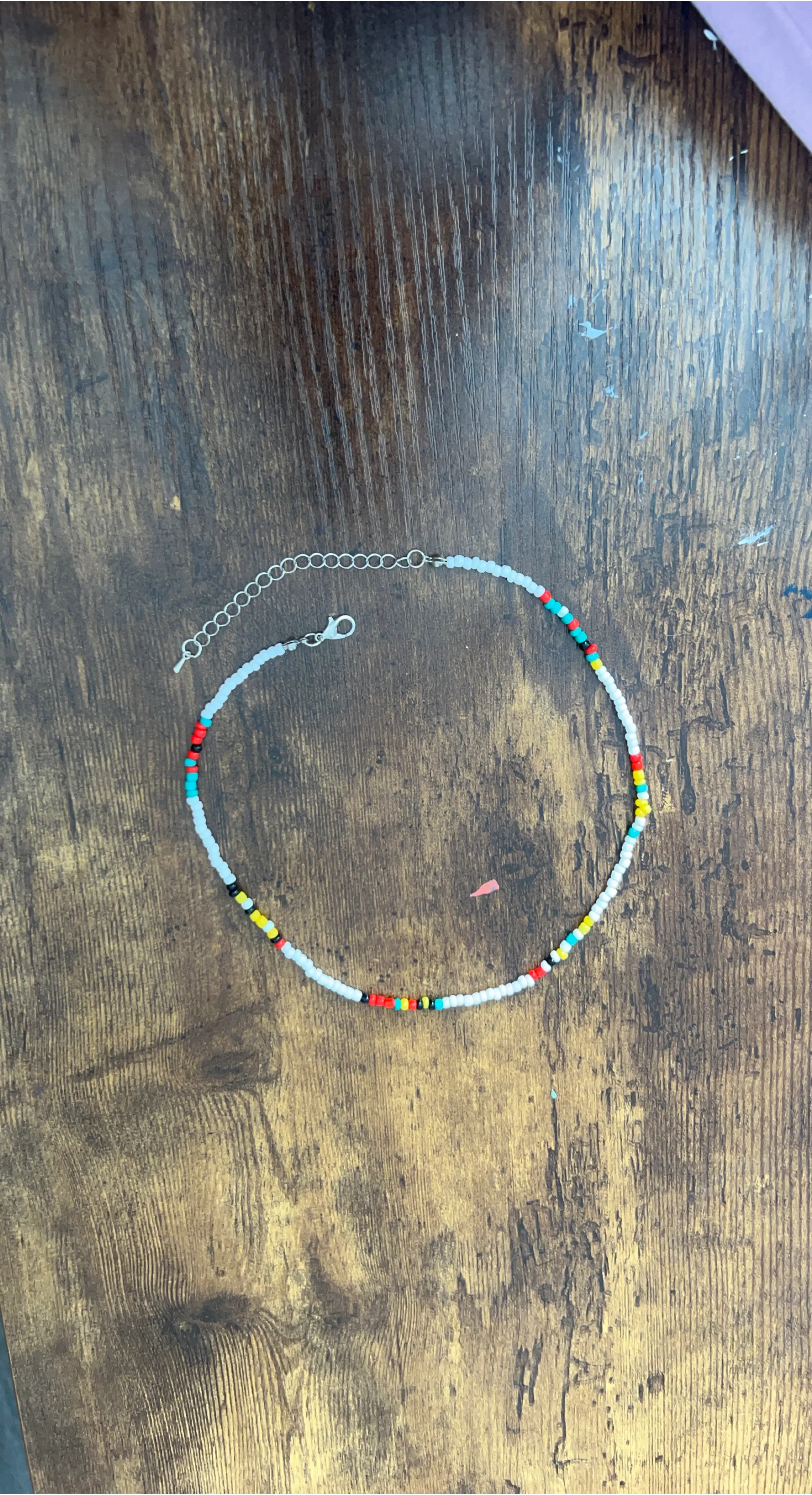 White beaded choker necklace with colourful accents. It's a fun accessory for everyday wear. Includes adjustable silver-tone chain and clasp.