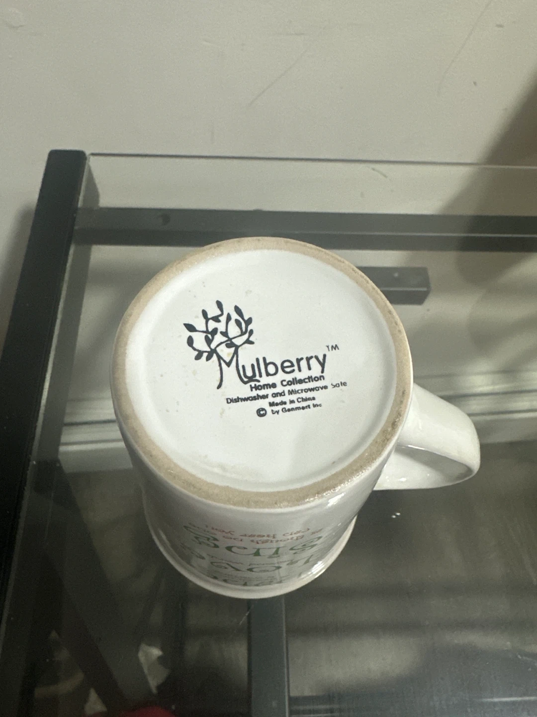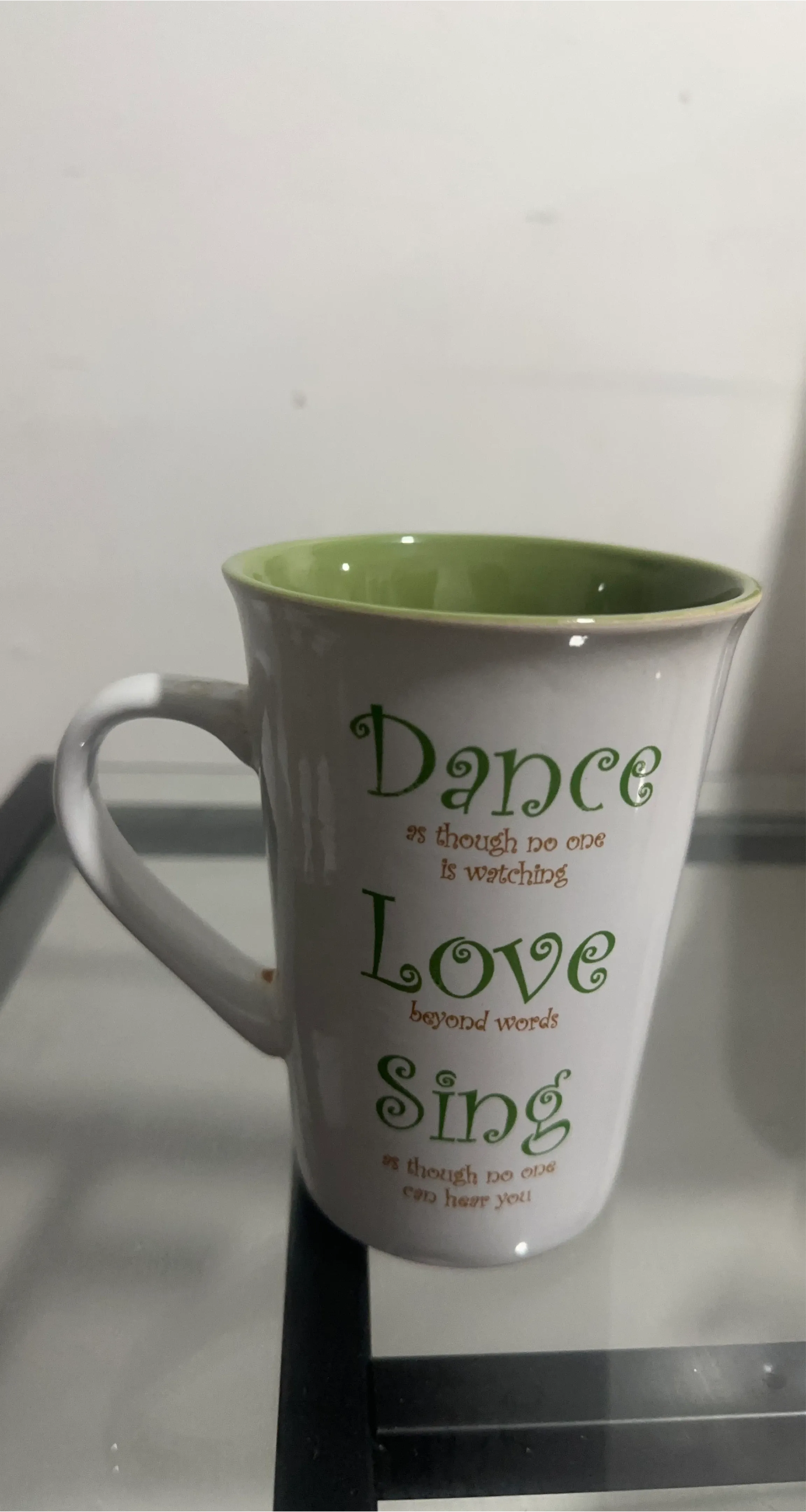 This Mulberry Home Collection mug features "Dance as though no one is watching, Love beyond words, Sing as though no one can hear you." It's dishwasher and microwave safe. White ceramic mug with green interior.