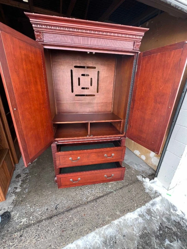 This solid wood armoire is a beautiful and functional piece, perfect for adding storage and style to any bedroom or living space. It is composed of two separate pieces stacked on top of each other. This armoire is in good condition and has been well-maintained. It's ready to be a functional focal point in your home with its timeless appeal and sturdy construction. I'm pricing it at a fair market value. It's still available if you're seeing this ad. Pick up only!