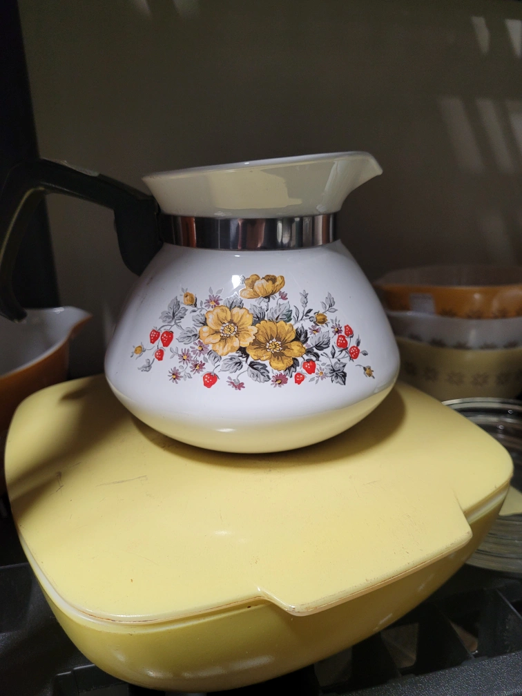 corelle brand Vintage enamel teapot. Floral pattern. Yellow and red flowers. Black handle. Metal band around spout. sorry, no lid. (it was plastic and broke in half sorry)