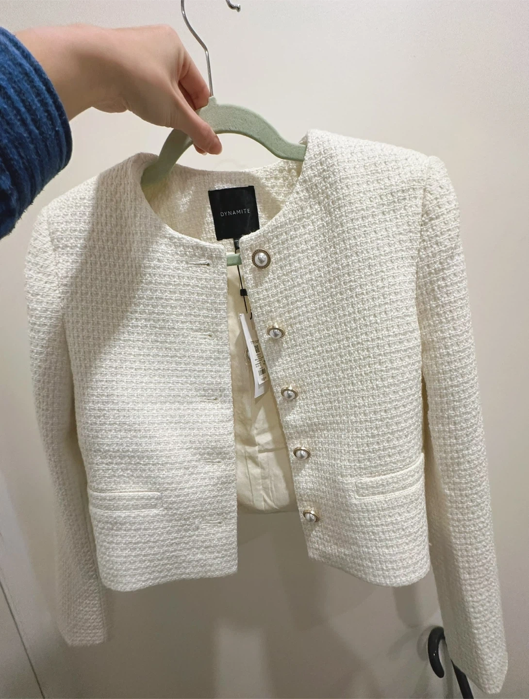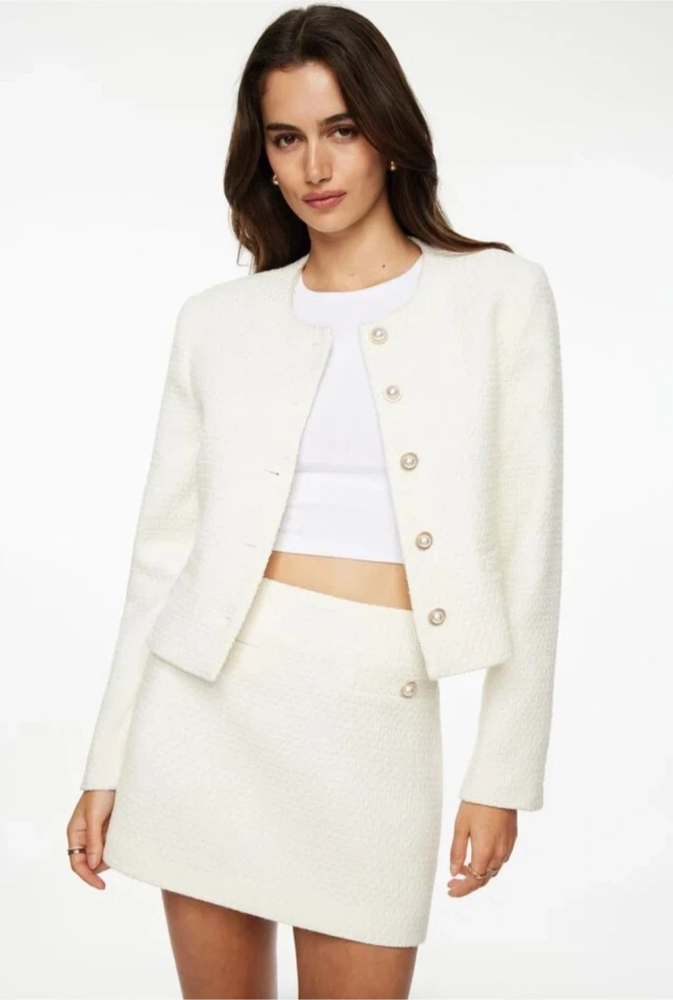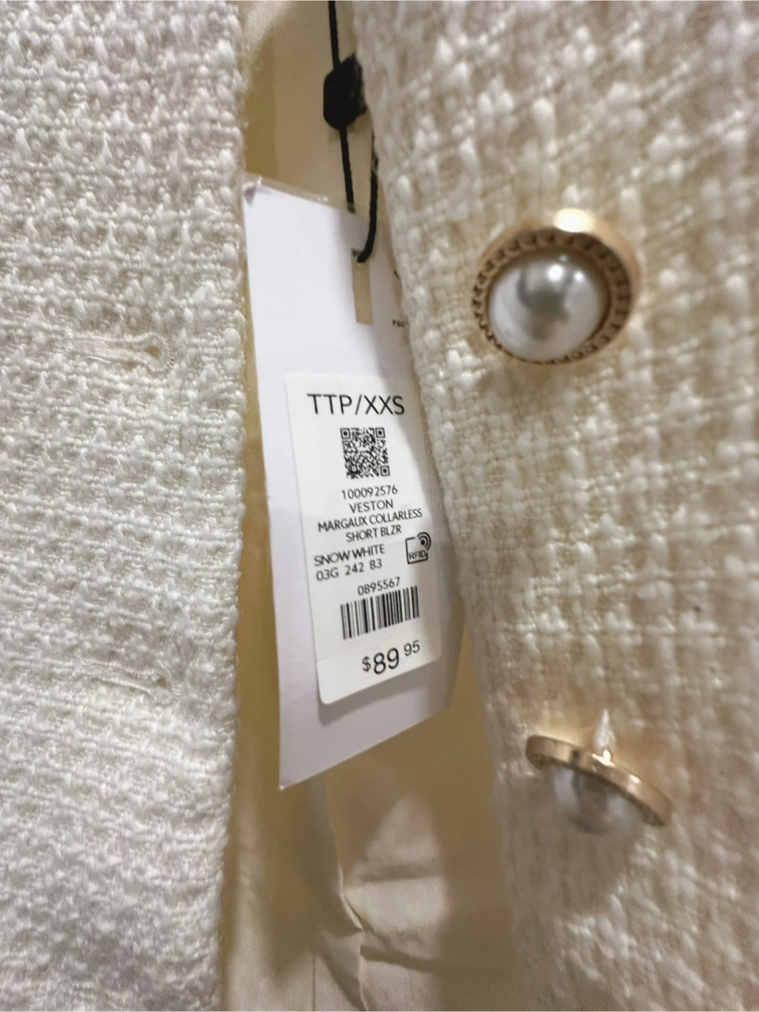 Brand New This Dynamite "Margot" jacket is a stylish collarless short design in Snow White. It's a size XXS with pearl and gold button details. This jacket is perfect for dressing up an outfit for a special occasion!