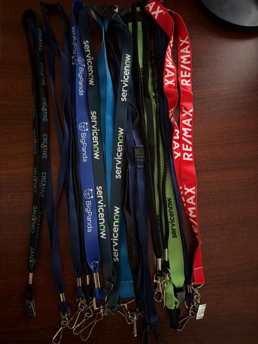 This lot of lanyards includes several company-branded lanyards from RE/MAX, ServiceNow, BigPanda, and Creative. They are made of fabric and feature metal clips. Perfect for employee identification or event access!