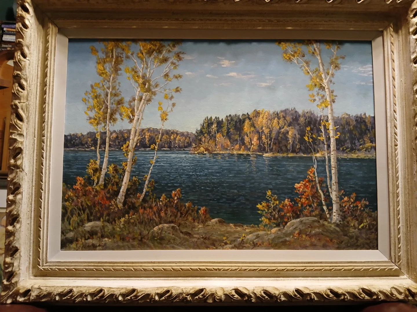 This framed painting depicts a serene lakeside scene in autumn. It features vibrant fall foliage and birch trees reflected in the calm water. The artwork is housed in an ornate, textured frame, ready to enhance any room's decor.