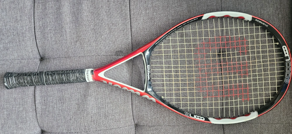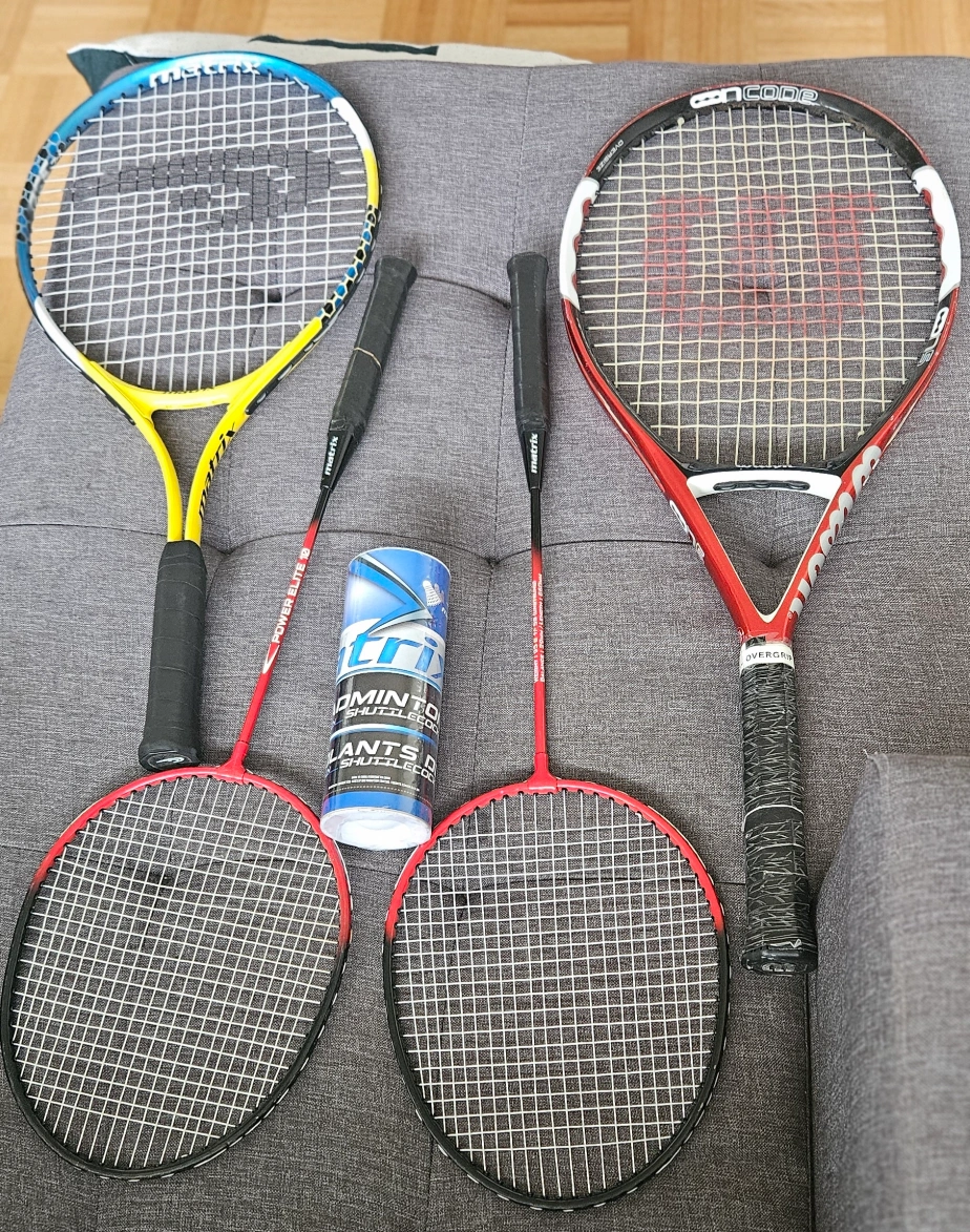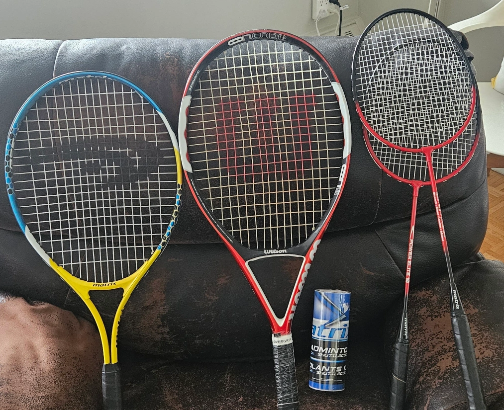 Set of 4 Rackets: one Wilson oversize Ncode N5 tennis racket, one Matriz Ace Jr, 2 Matrix Power Elite 10 badminton rackets and one badminton shuttlecocks.