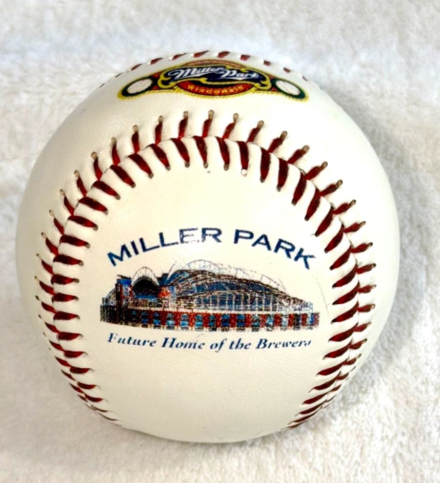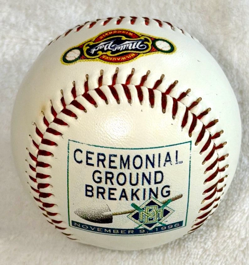 This is a vintage, limited edition 1996 collector's baseball commemorating the official ground breaking ceremony for Miller Park. It features an image of the future stadium with the text "Future Home of the Brewers". The baseball is new in its original Rawlings box and still wrapped in manufacturer plastic. It's been stored for many decades and was only removed for photos. This is a standard size souvenir baseball produced by Fotoball, a limited edition collectible for fans of the Major League Baseball team. Cash only sale. Buyer must pick up from the Morton Grove Area.