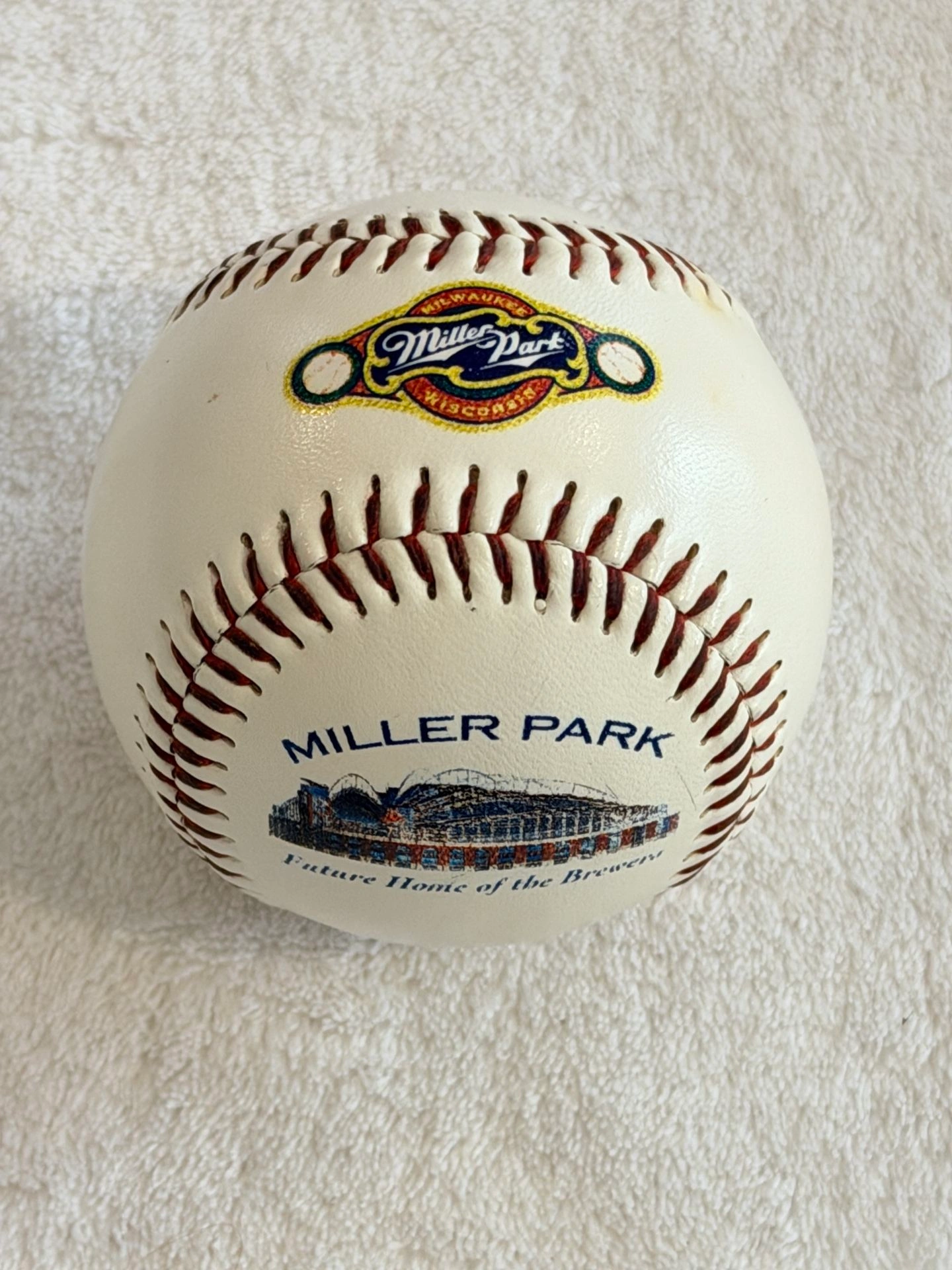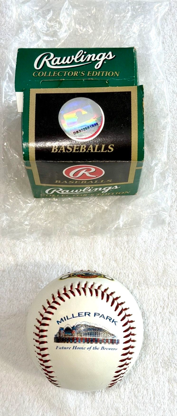 This is a vintage, limited edition 1996 collector's baseball commemorating the official ground breaking ceremony for Miller Park. It features an image of the future stadium with the text "Future Home of the Brewers". The baseball is new in its original Rawlings box and still wrapped in manufacturer plastic. It's been stored for many decades and was only removed for photos. This is a standard size souvenir baseball produced by Fotoball, a limited edition collectible for fans of the Major League Baseball team. Cash only sale. Buyer must pick up from the Morton Grove Area.