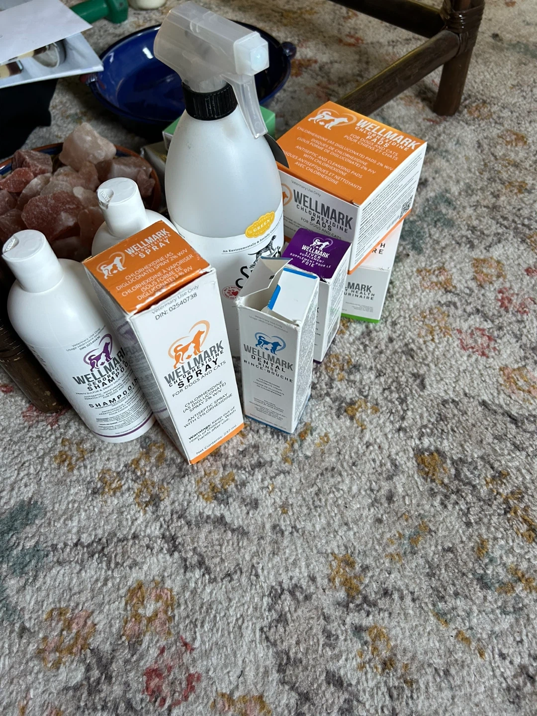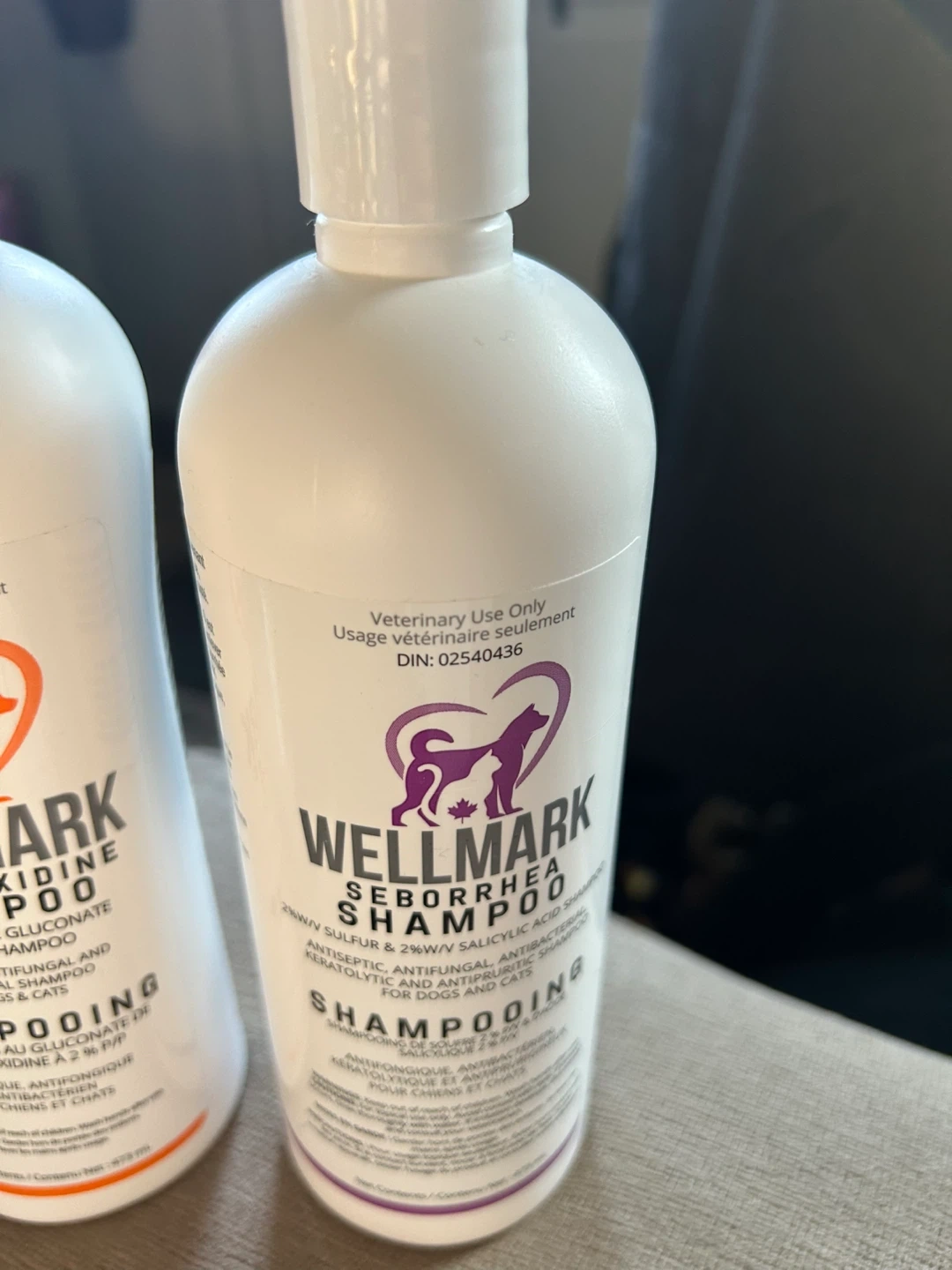 This bundle includes WellMark Sebhorrea Shampoo and WellMark Chlorhexidine Spray, both for veterinary use on dogs and cats. The shampoo is antiseptic, antifungal, and antibacterial. The spray contains 2% chlorhexidine.