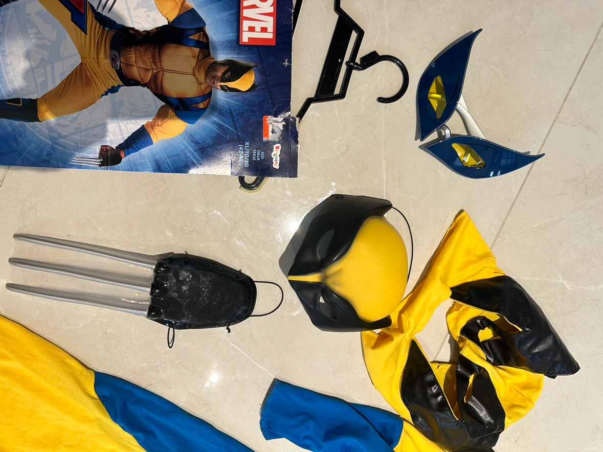 Wolverine costume includes jumpsuit, mask, claws, and eye mask. Size: X-Large (14-16)