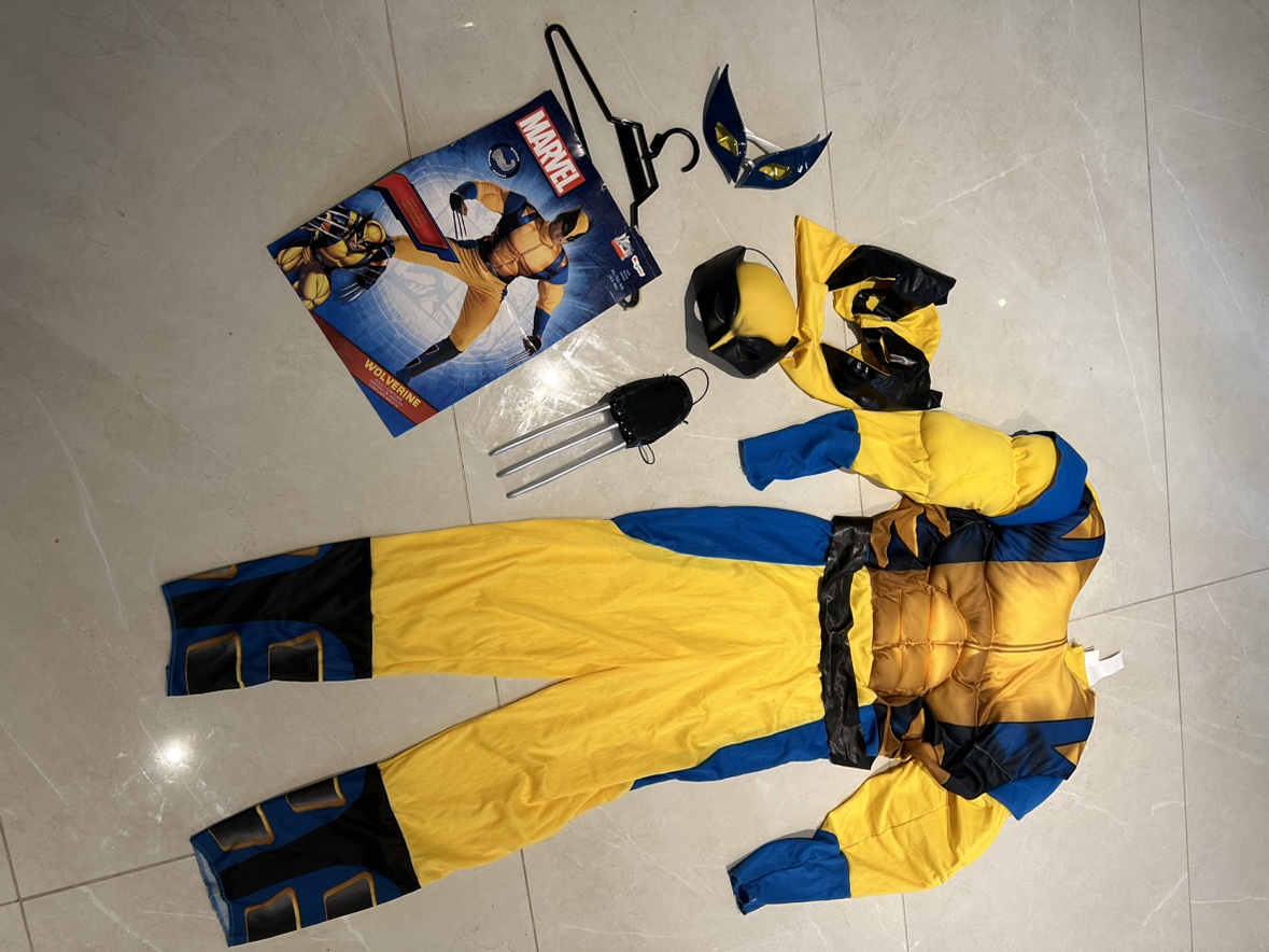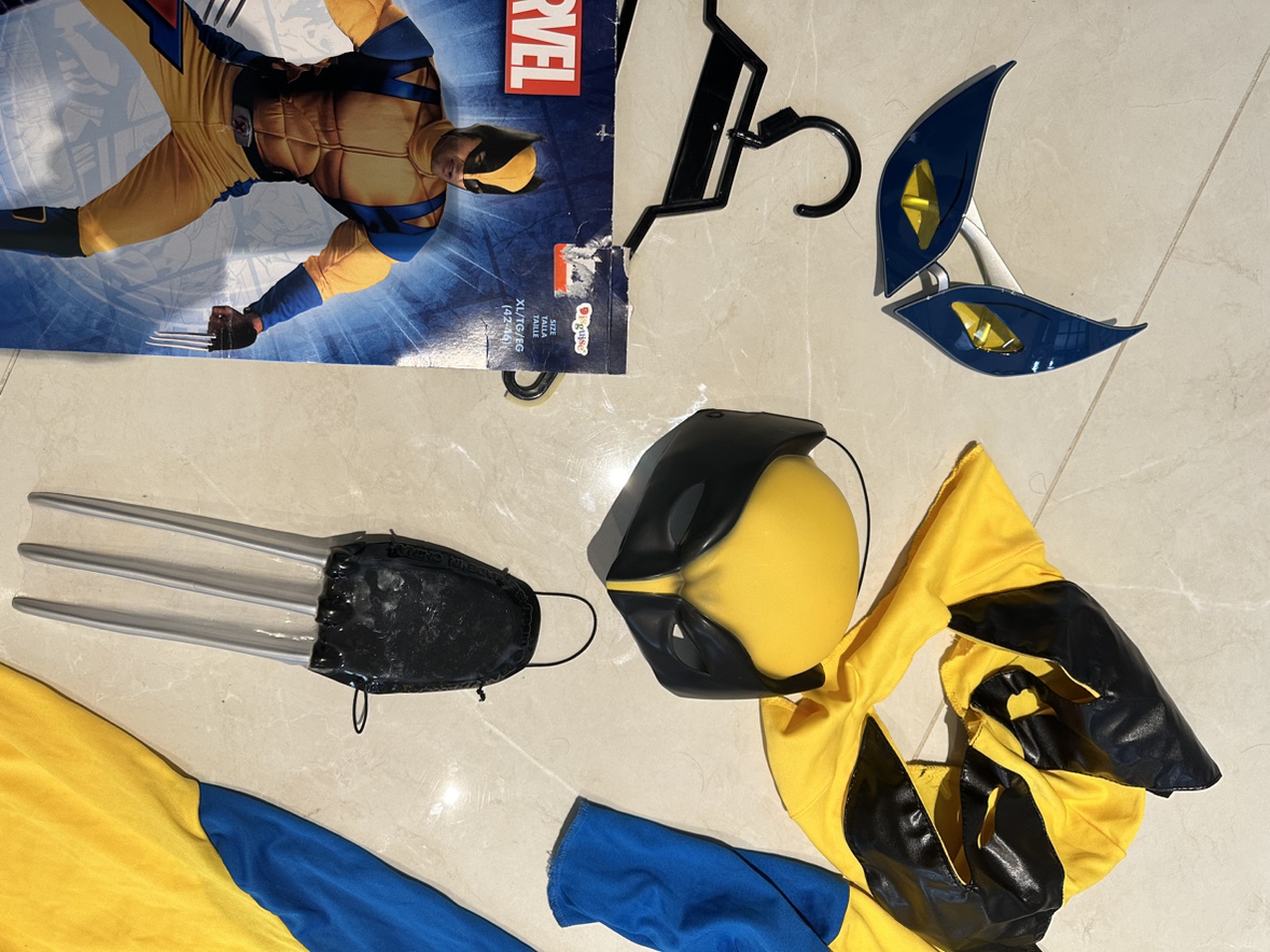 Wolverine costume includes jumpsuit, mask, claws, and eye mask. Size: X-Large (14-16)