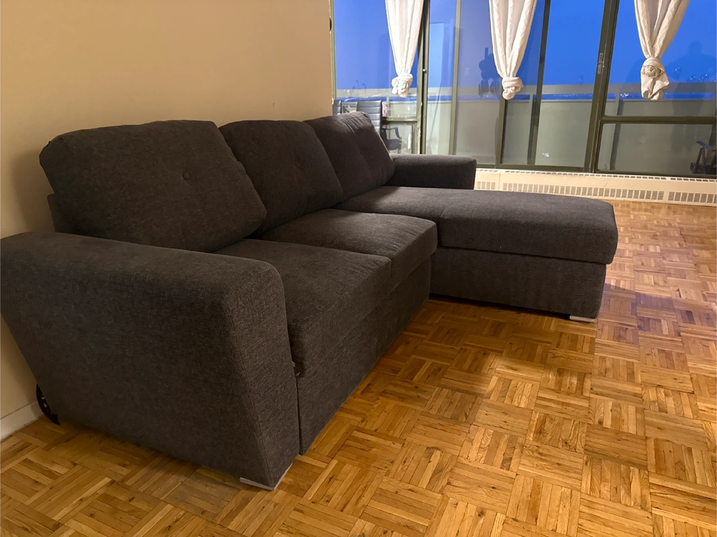 Three-seat sectional sofa in a dark grey fabric. Offers ample seating space. Its chaise lounge can be positioned on either side.