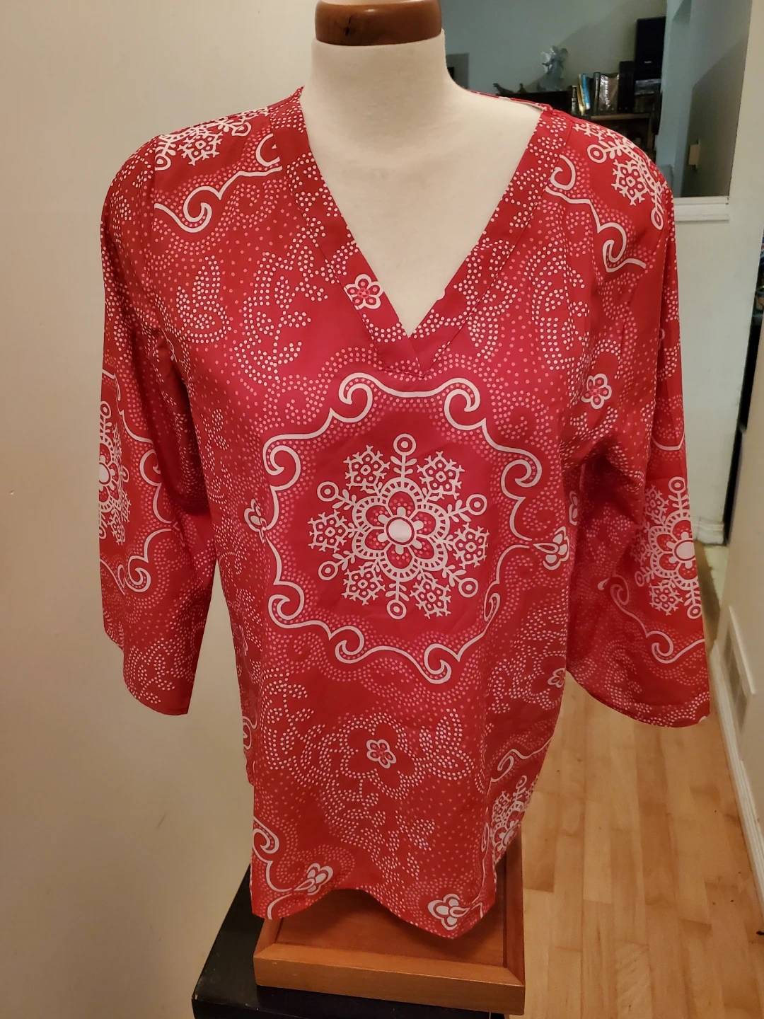 A stylish tunic top featuring a vibrant red and white all-over pattern. It has a classic V-neck and 3/4 length sleeves. It's perfect for layering or wearing on its own. Cedar pick up.