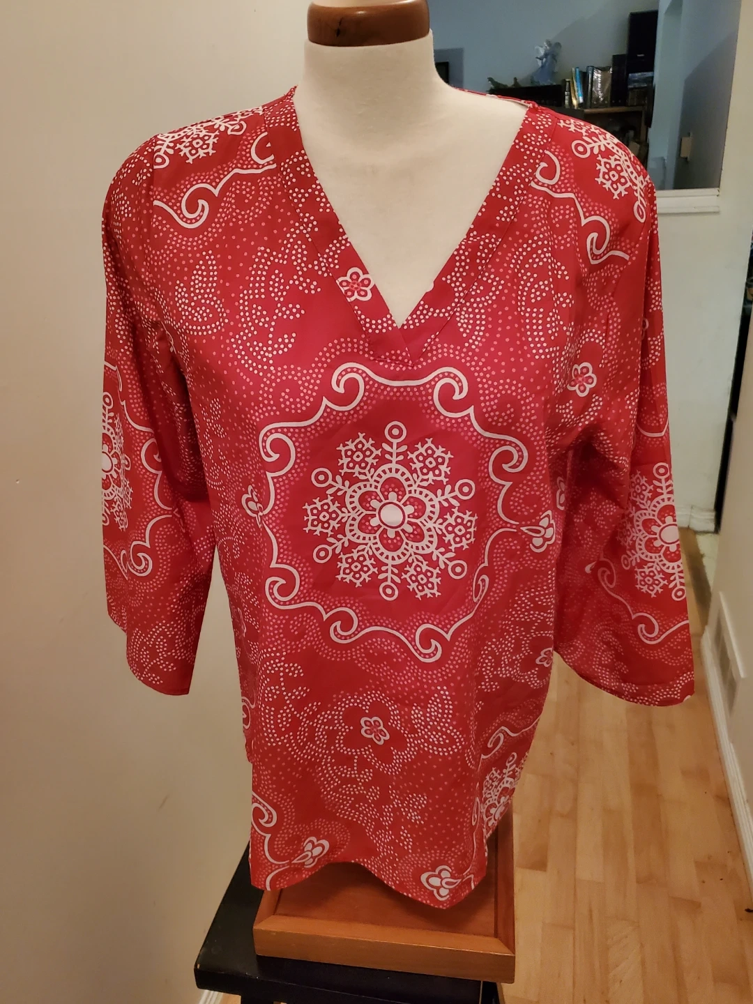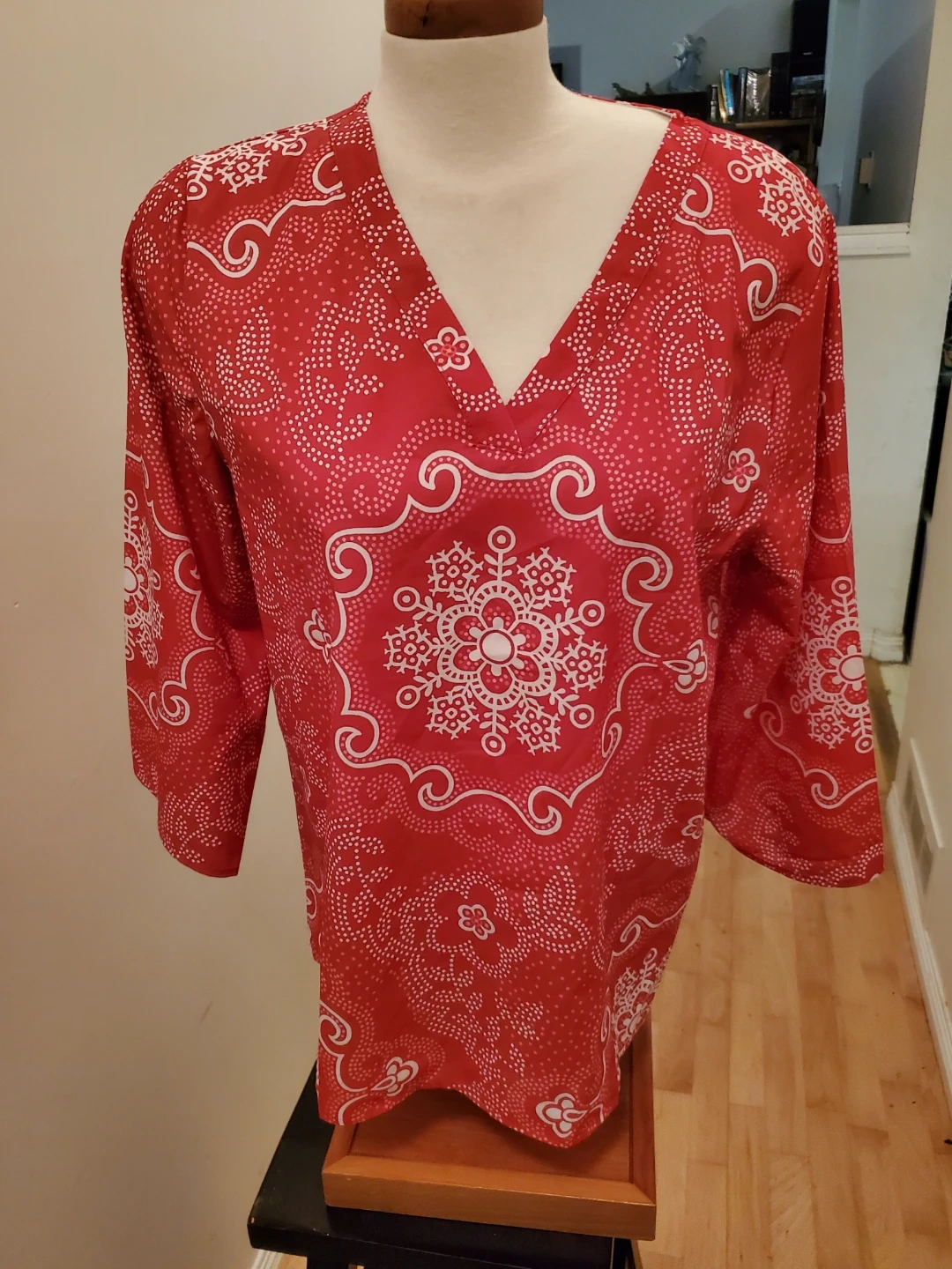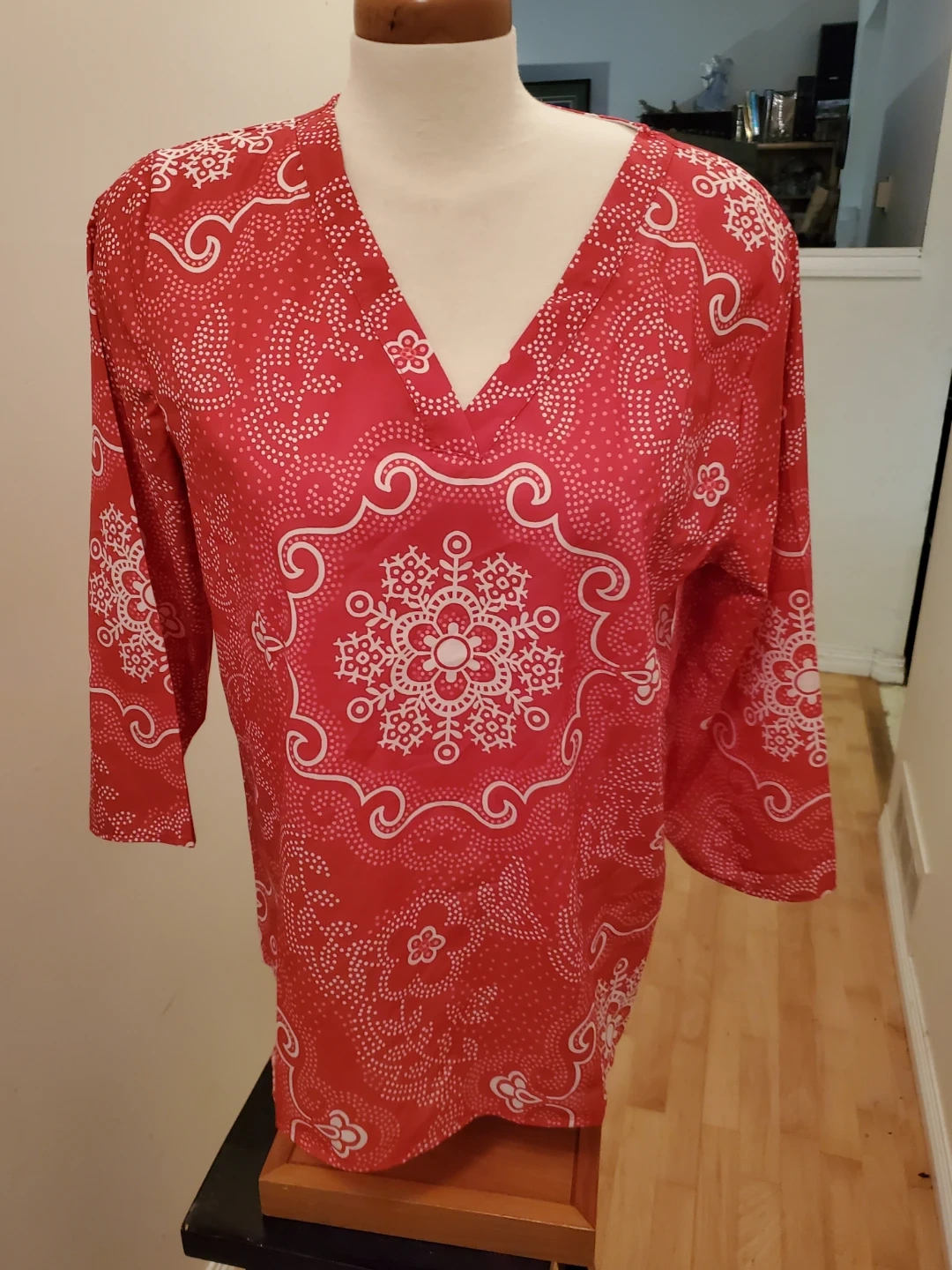 A stylish tunic top featuring a vibrant red and white all-over pattern. It has a classic V-neck and 3/4 length sleeves. It's perfect for layering or wearing on its own. Cedar pick up.