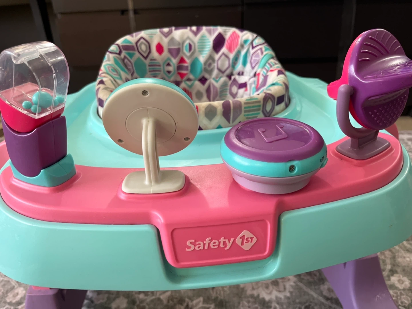This Safety 1st baby walker has a colourful padded seat and engaging play tray with toys. It's designed to help little ones explore their surroundings. Perfect for babies learning to walk and explore!
