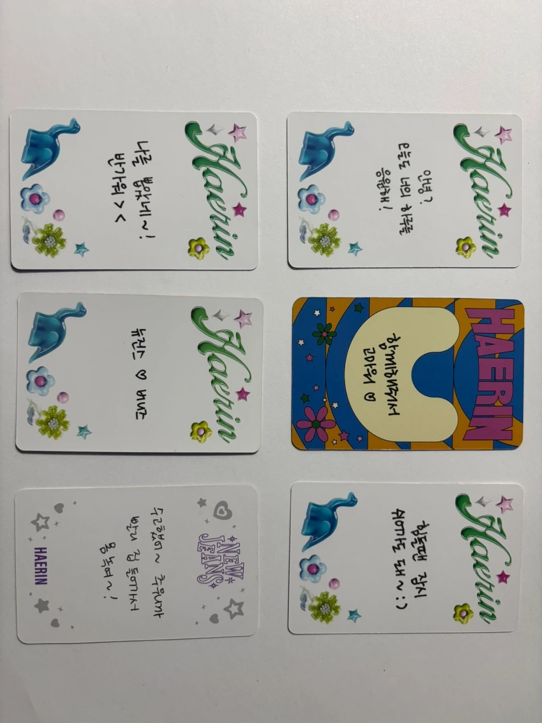 Set of six NewJeans Haerin photocards. Features images of Haerin on the front and handwritten messages on the back. Perfect for fans of NewJeans! 18 dollars for all 6, 4 for a specific one!