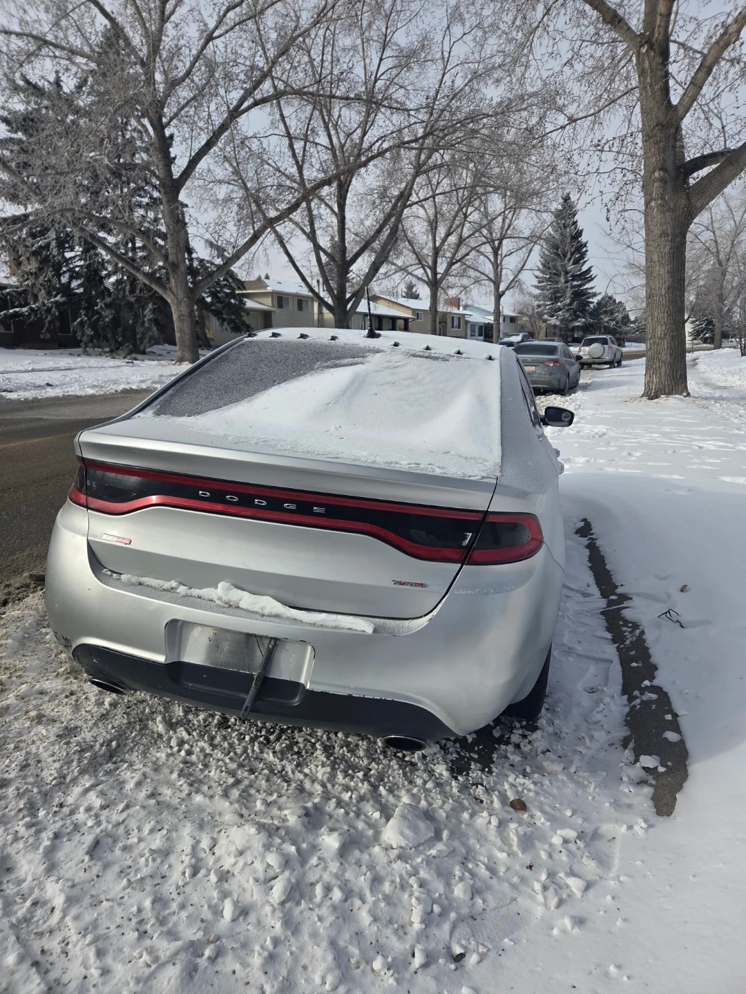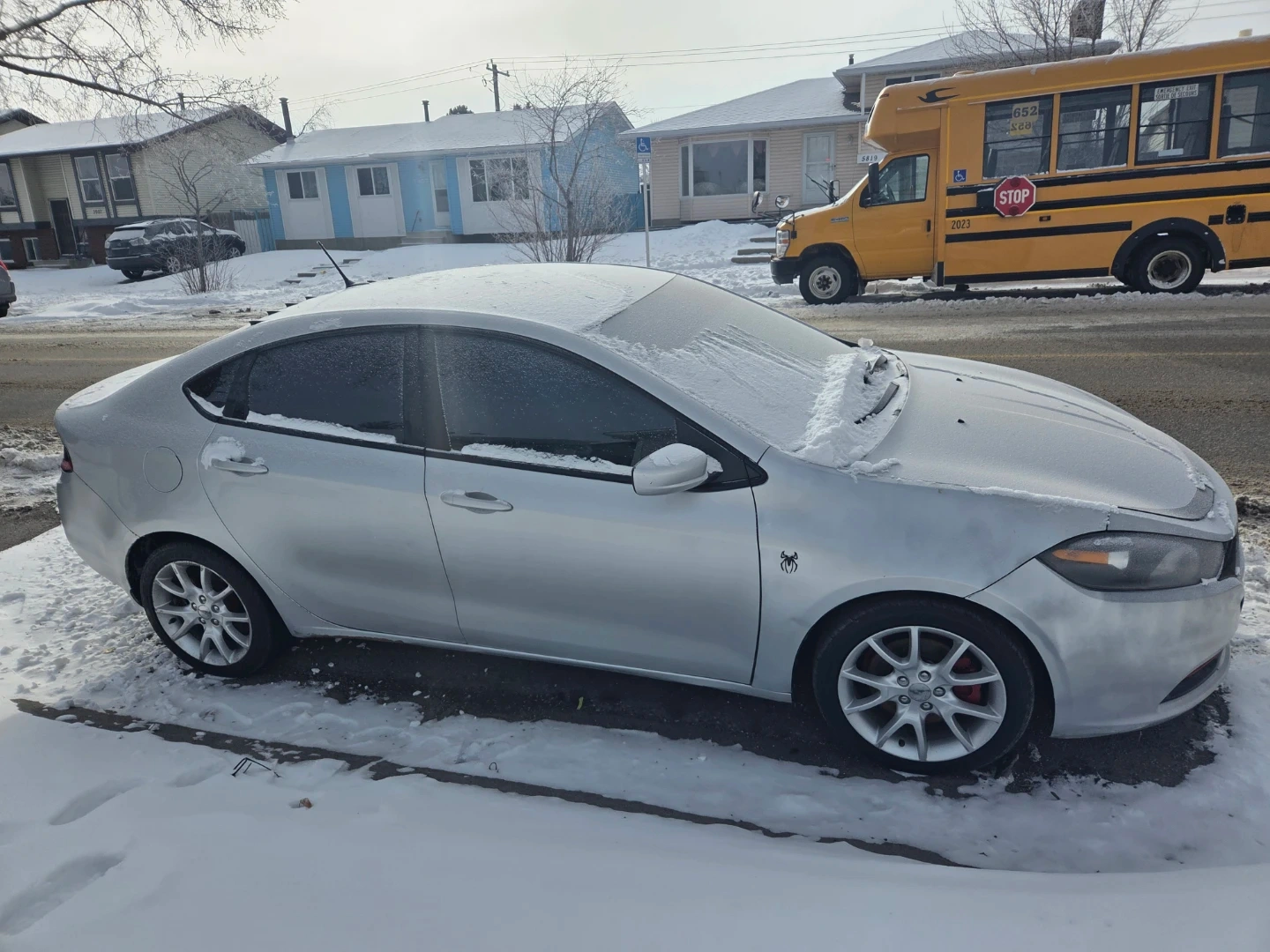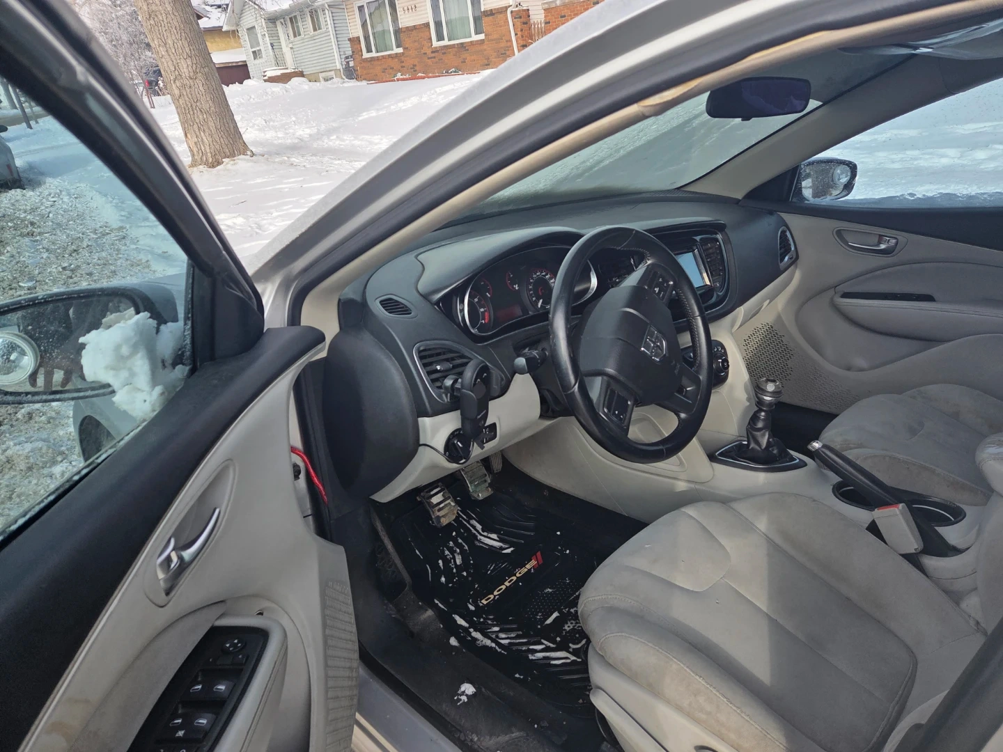This is a silver Dodge Dart sedan. It's a four-door car with a clean interior, featuring fabric seats and a functional dashboard. Perfect for navigating city streets or for daily commutes.it needs battery to Start only.200.000km manual