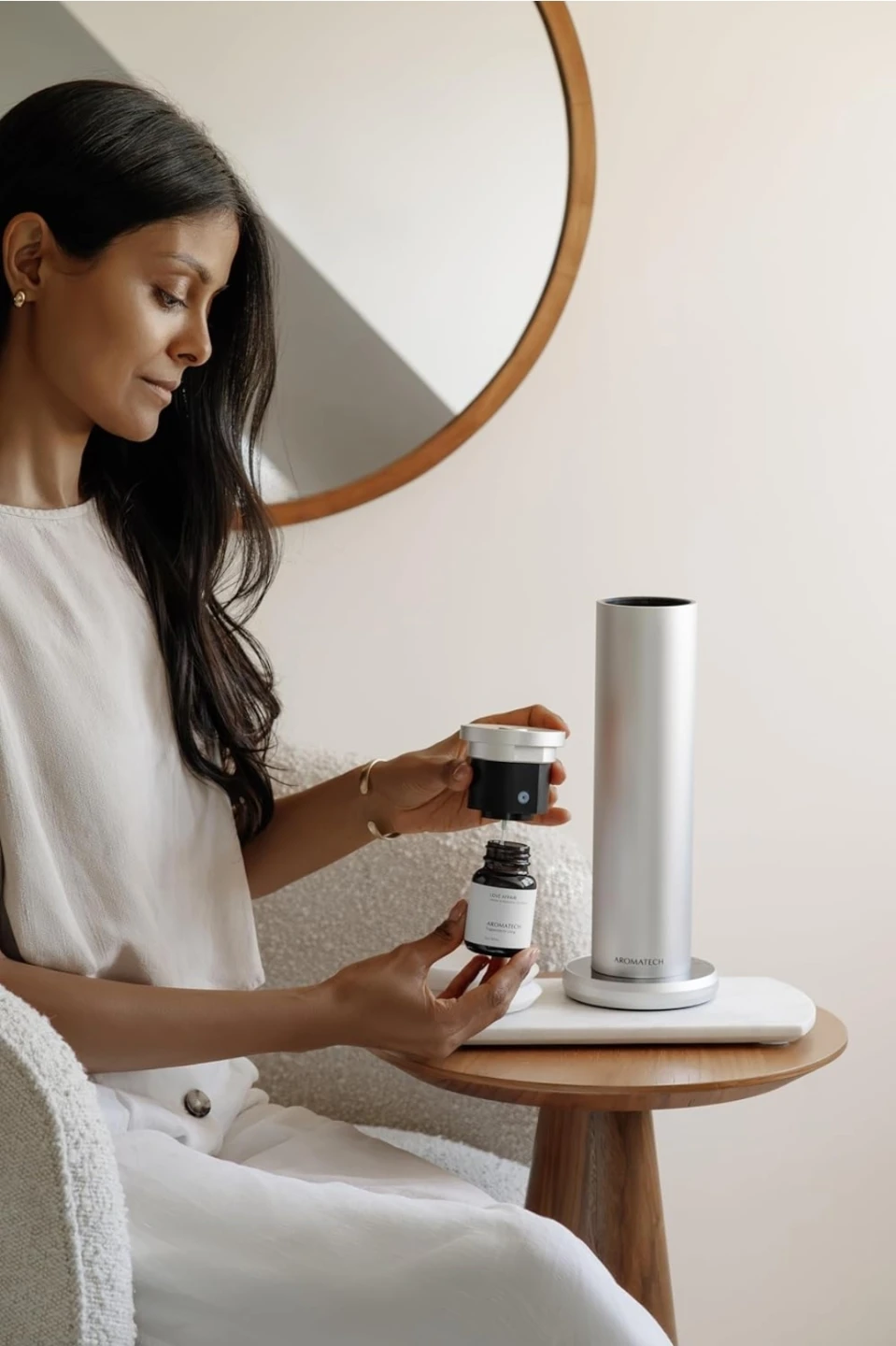 I'm selling an AromaTech AroMini BT Plus scent diffuser in Gold tone. It features cold-air diffusion technology and scent intensity control. It's whisper quiet and can scent spaces up to 1,500 sq ft. This diffuser uses plug & play refills and doesn't require any heat or water!