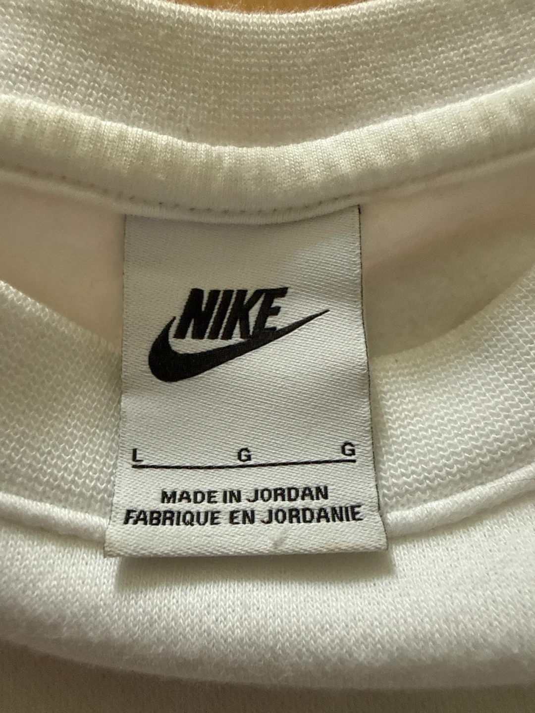 White Nike crewneck sweatshirt. Features the classic Nike Swoosh logo. Made in Jordan.
