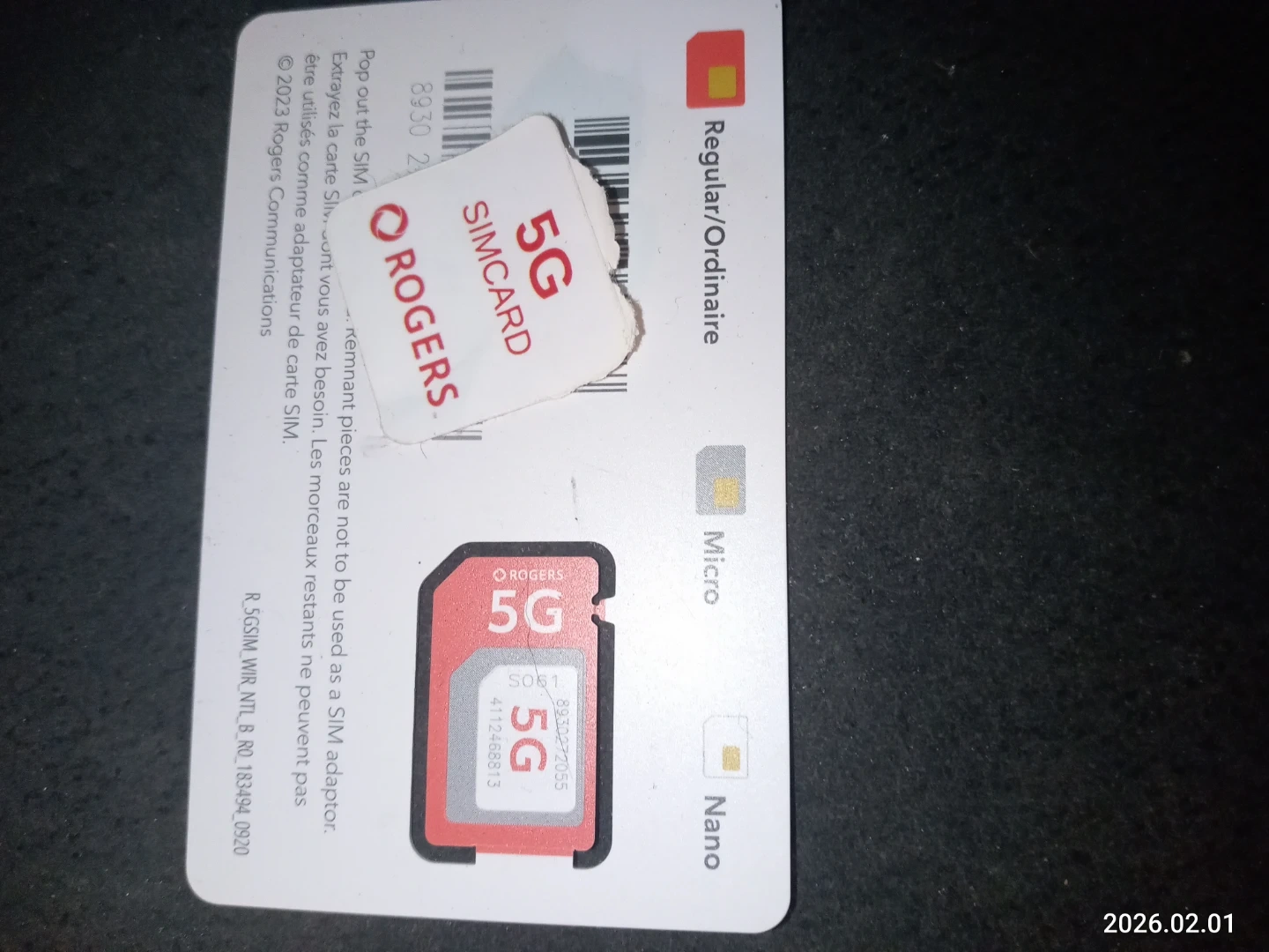 This is a Rogers 5G SIM card. It's a triple-cut SIM that can be used as a regular, micro, or nano SIM. The card includes remnant pieces that are not to be used as a SIM adapter.