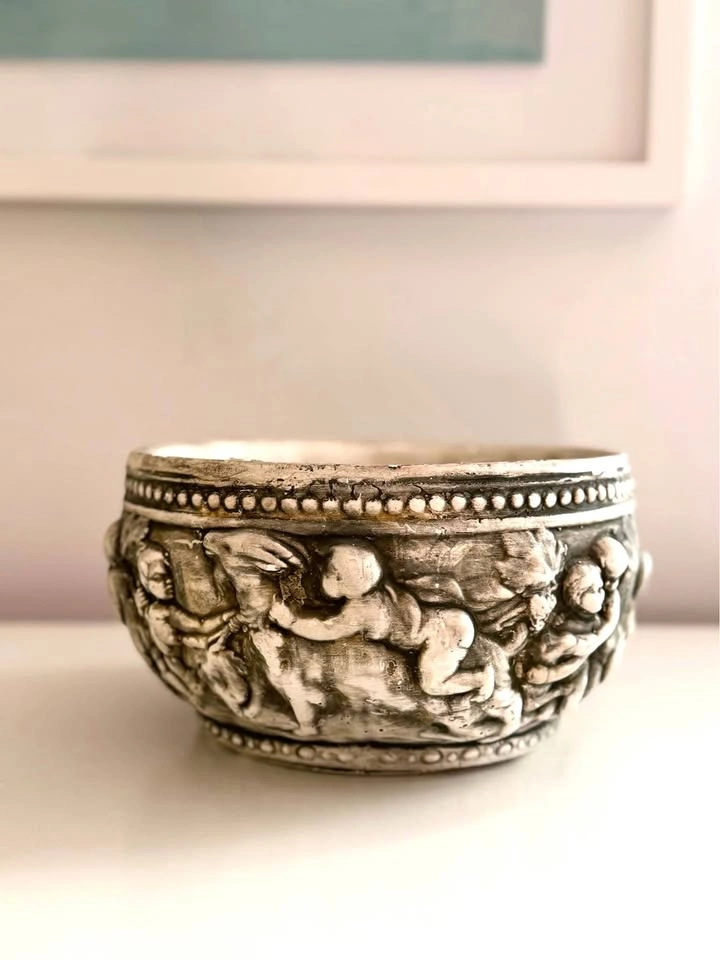 Can also be used as a decorative bowl, perfect as a centerpiece, fruit bowl, or decorative dish. Features a detailed cherub/angel pedestal design. Adds a touch of elegant Romantic style to any room.