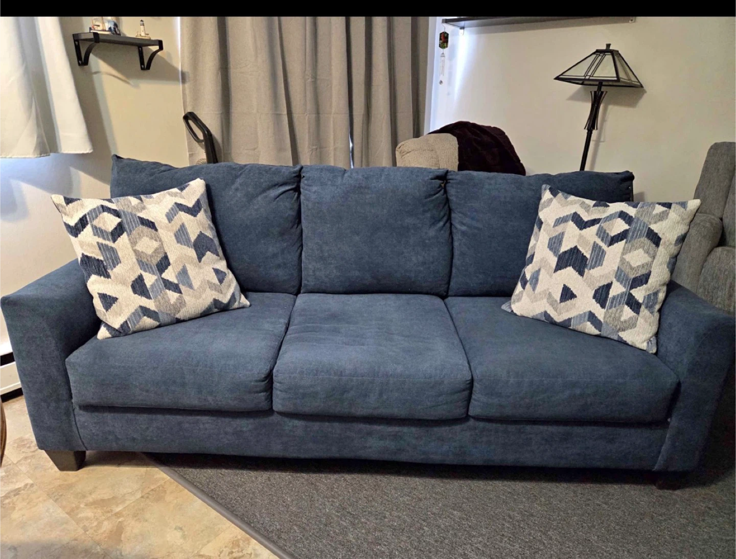 A comfortable blue fabric sofa with three seat cushions and three back cushions. It includes two decorative geometric throw pillows. Upholstered in a durable blue fabric.