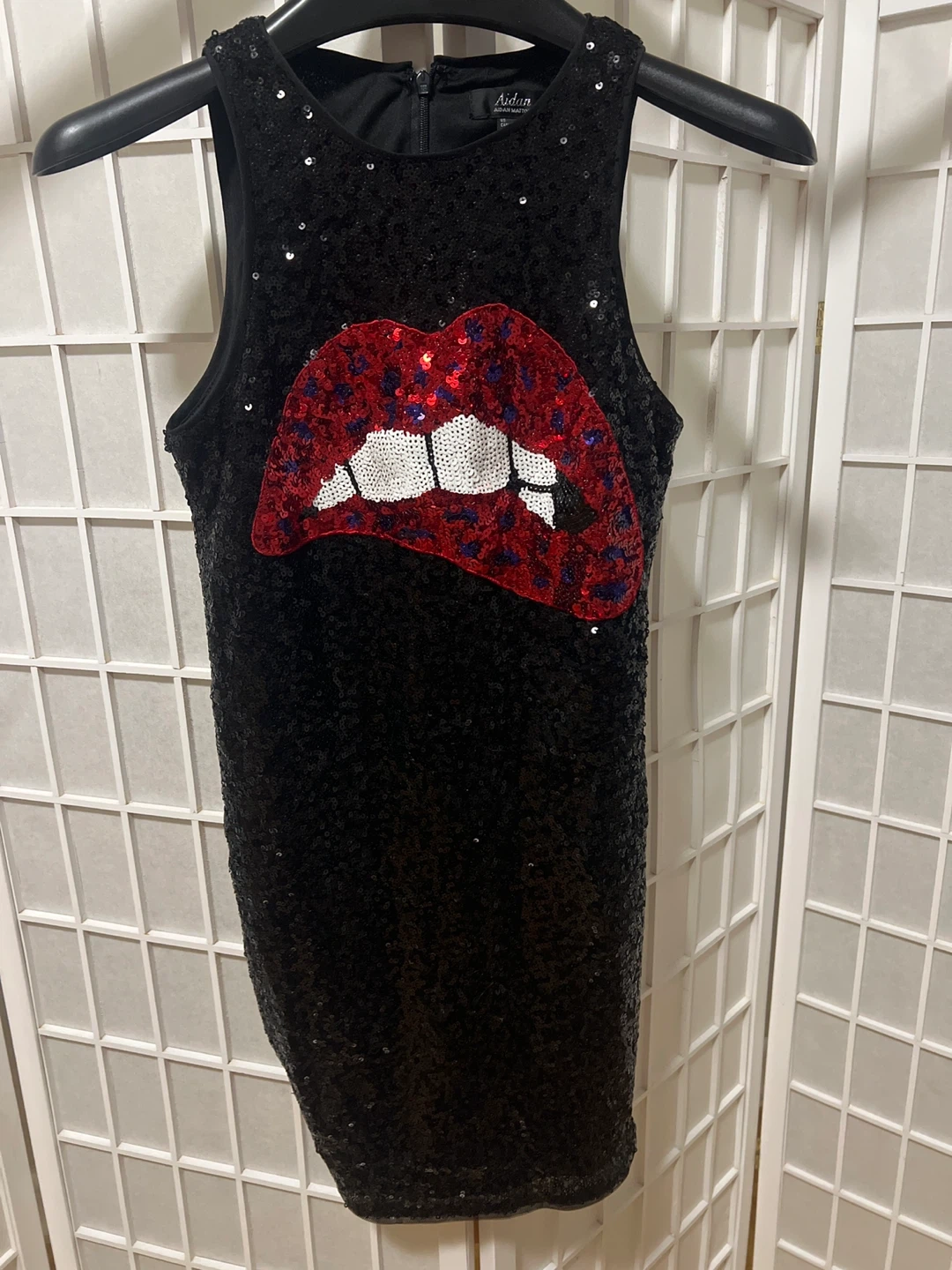 Black sequin sleeveless dress with a large sequin lip appliqué. It's a statement piece! Fully sequined exterior. Back zipper closure.