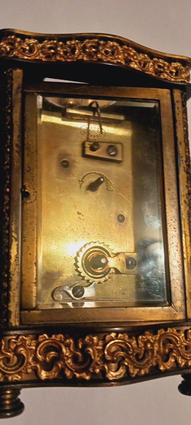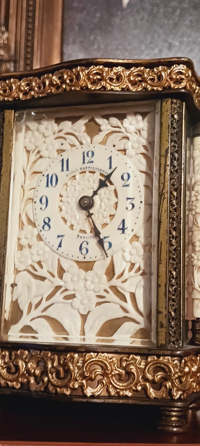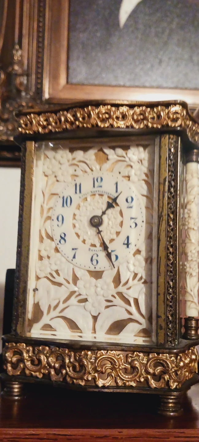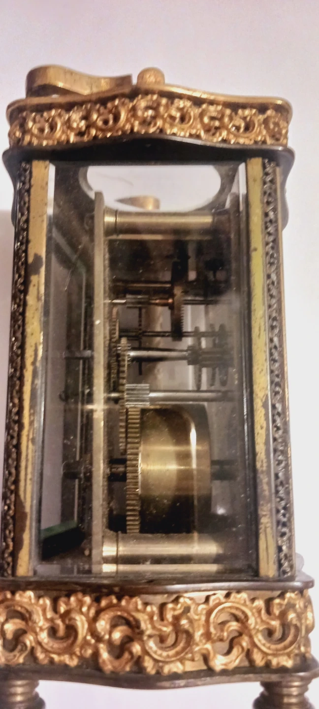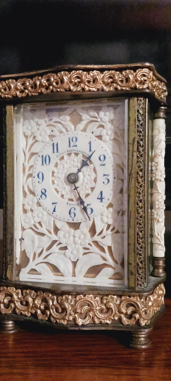 Absolutely Gorgeous Antique 19th Century French / German Carriage Clock with floral carved bone design interior. It is signed by A. Koenigsberger, Berlin. It is small size but very heavy. It is made of gold gilt beautiful filigree workmanship heavy solid bronze and with carved bone inside the clock. It has a beautiful floral design and intricate details. It has a solid bronze Carriage Handle on the top. Perfect addition for your Antique Collection !! 7"×4"×3". It is not tested, selling as is. ALL MY PRICES ARE NEGOTIABLE !!