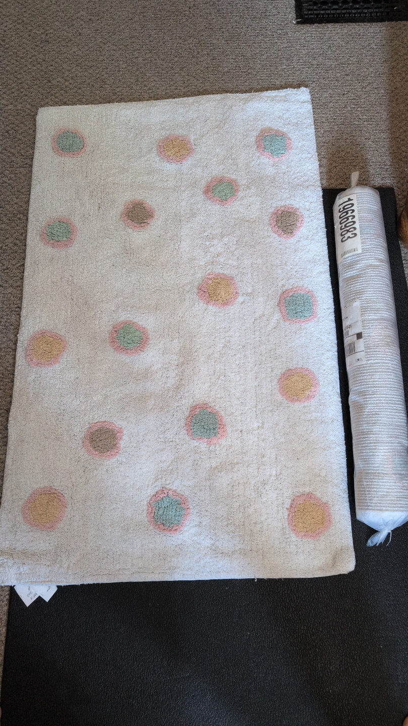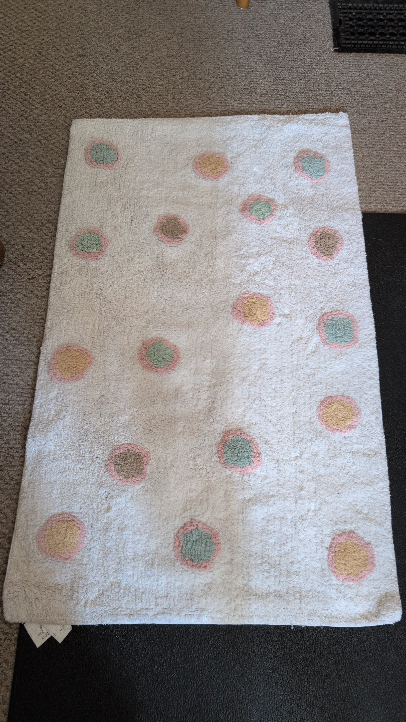 Adorable rug featuring pastel coloured dots on an off-white background. Soft and fluffy texture. Perfect for a child's room or any space needing a pop of colour. Rolled for easy transport. $10 each, or $15 for both.
