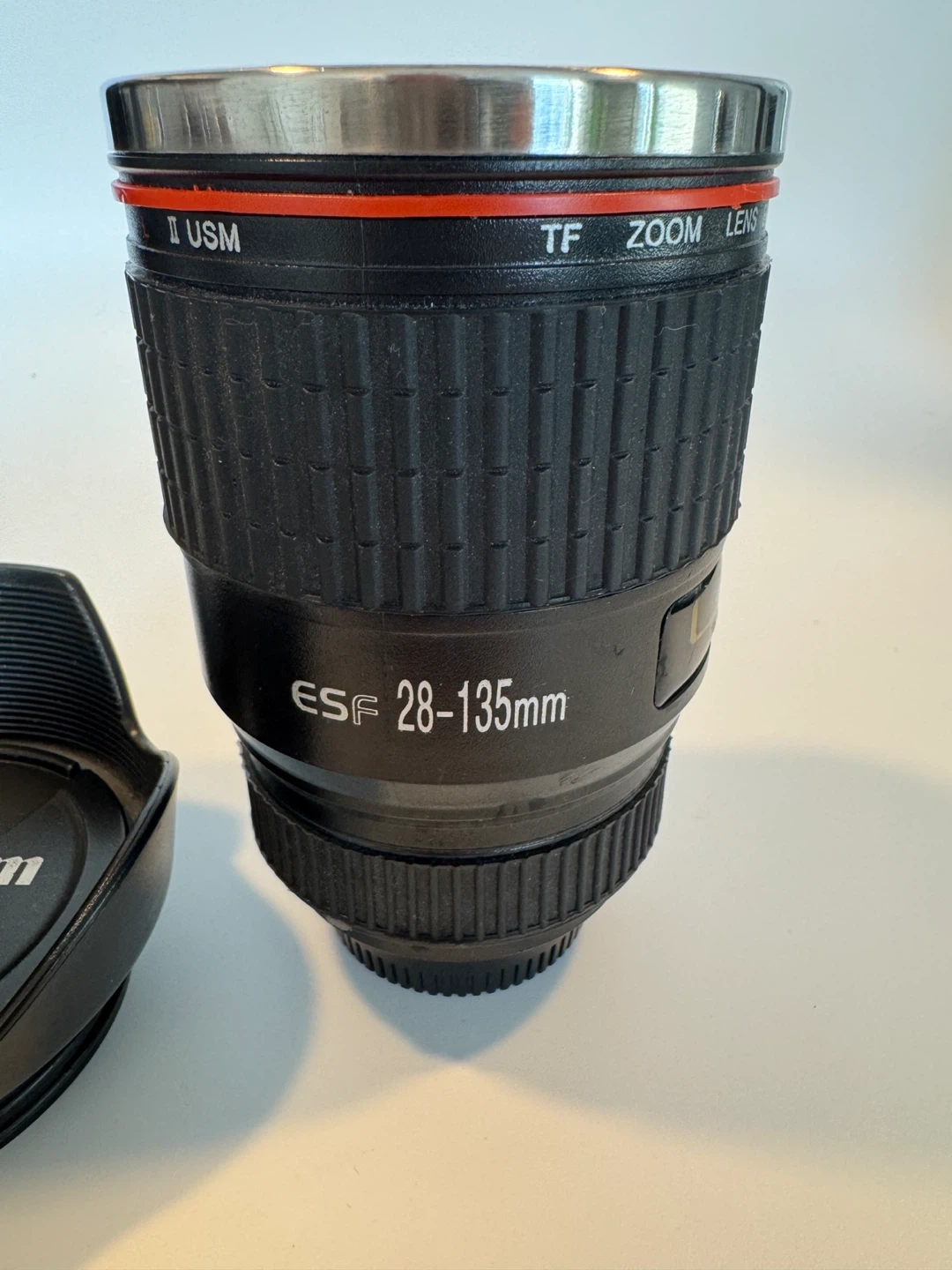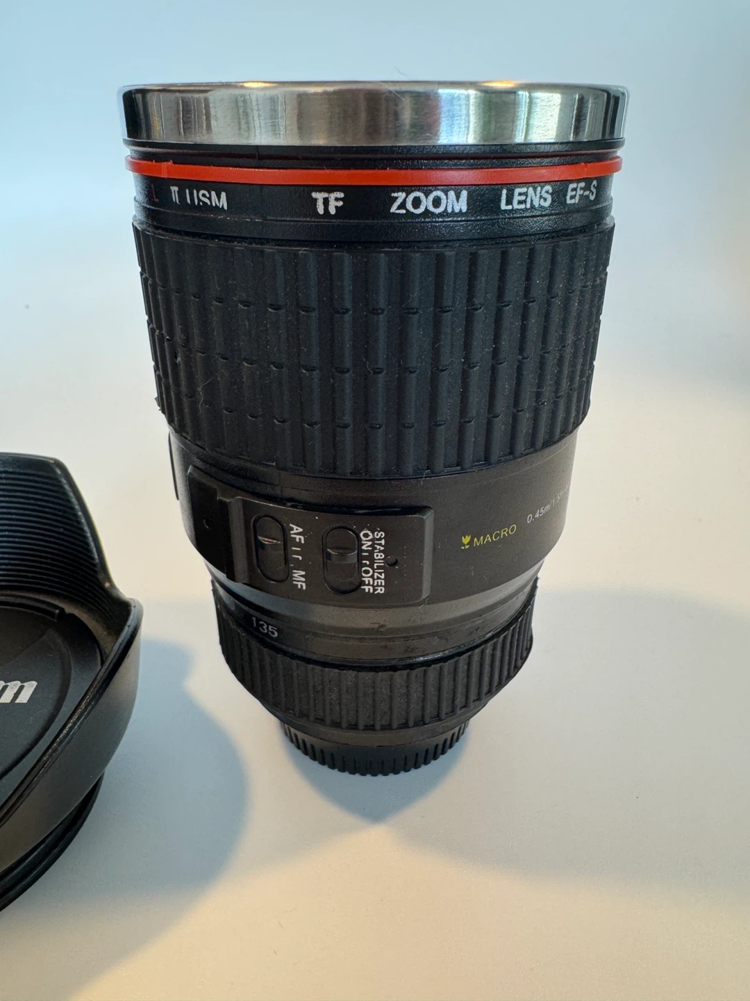 This is a novelty mug designed to look like a Canon EF-S 28-135mm zoom lens. It's made with a stainless steel interior and comes with a lens hood cap. Fun for photographers (and coffee lovers).