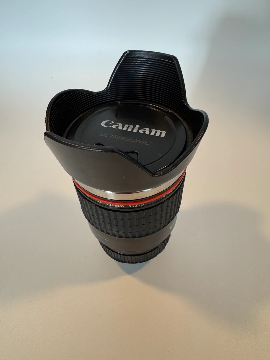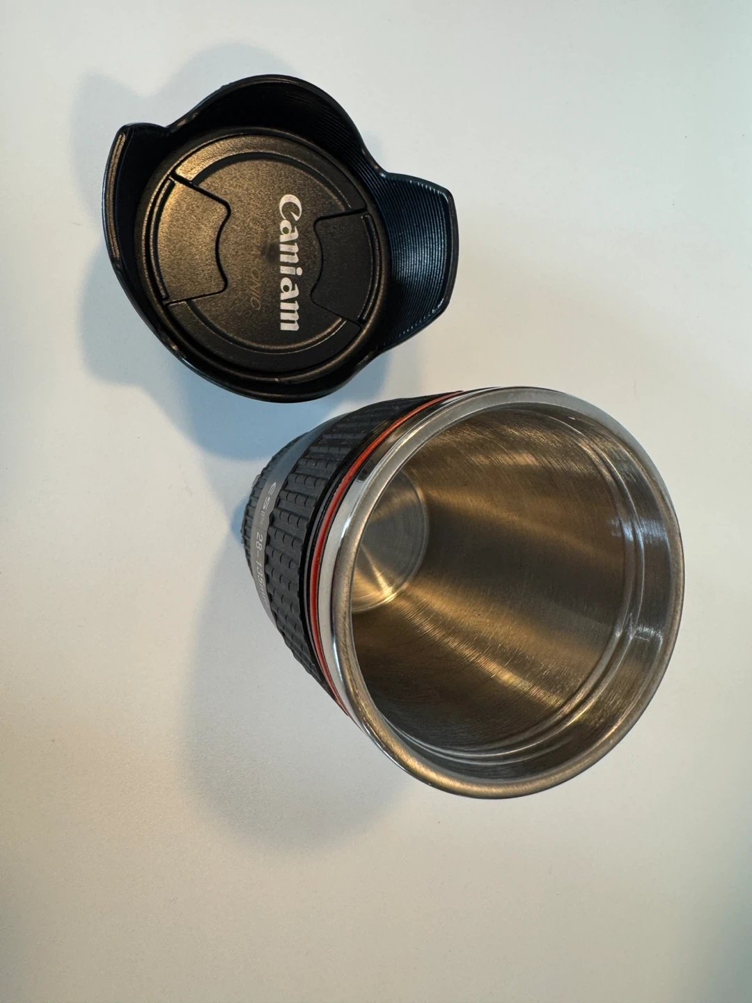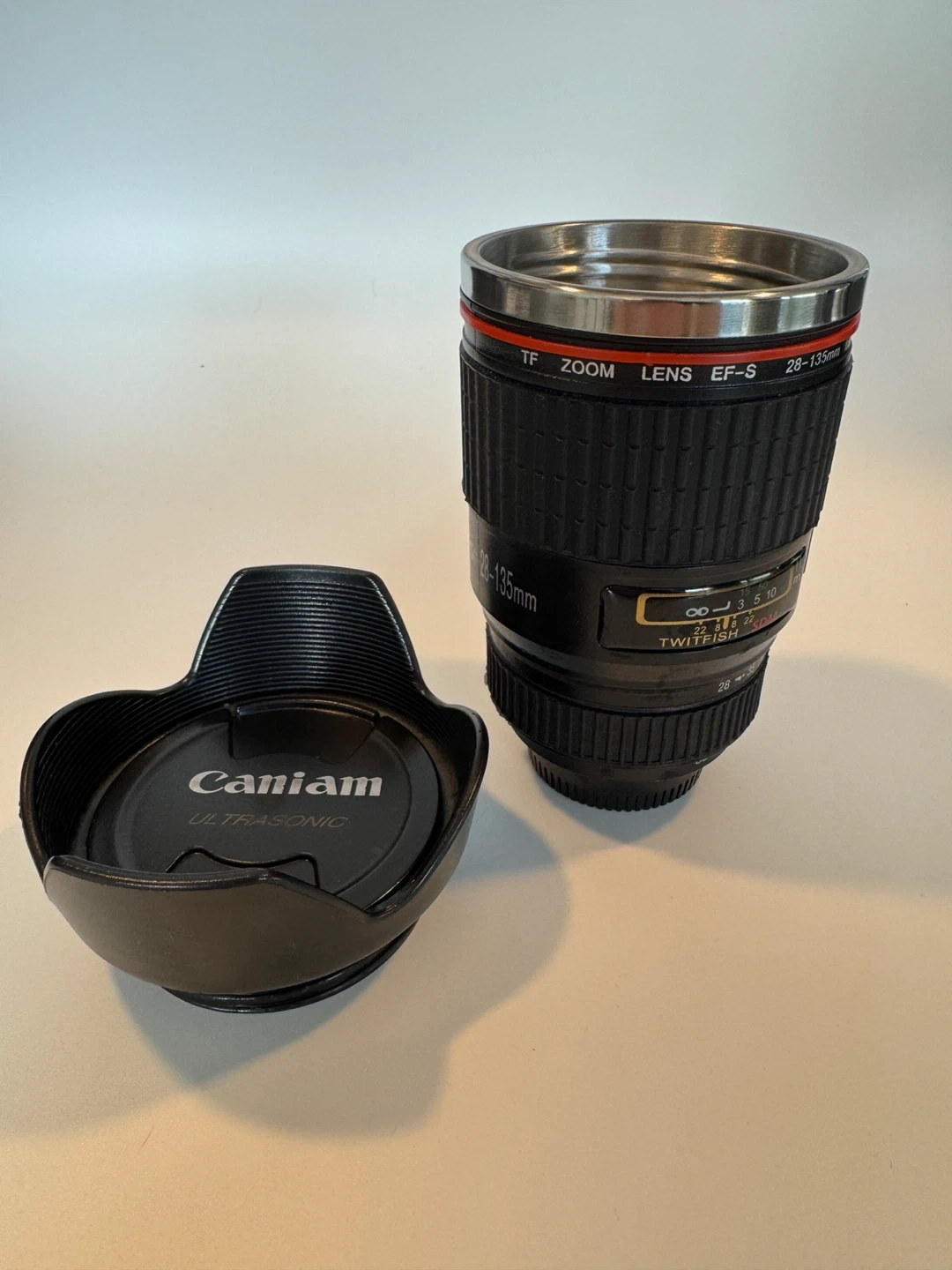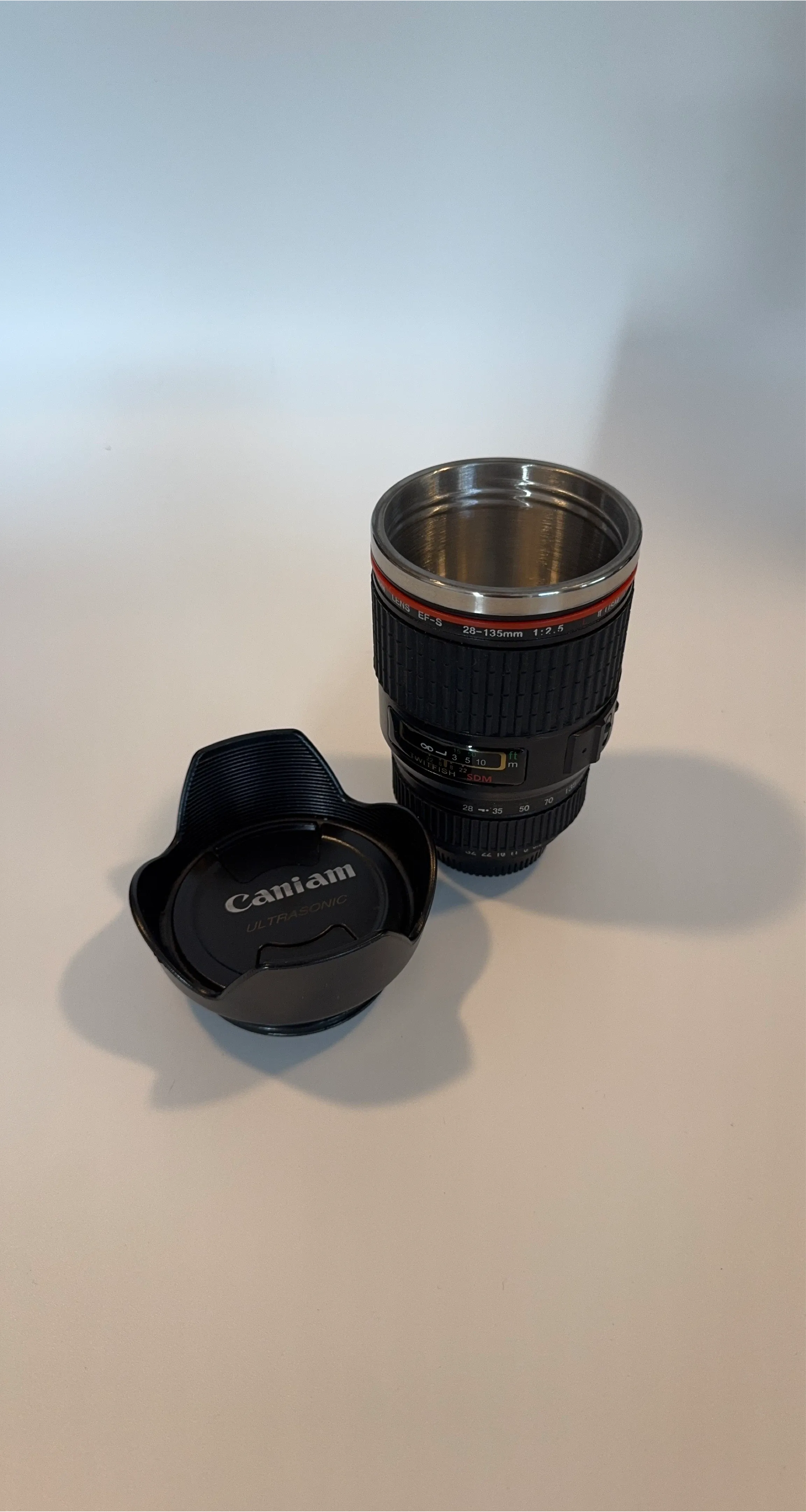This is a novelty mug designed to look like a Canon EF-S 28-135mm zoom lens. It's made with a stainless steel interior and comes with a lens hood cap. Fun for photographers (and coffee lovers).