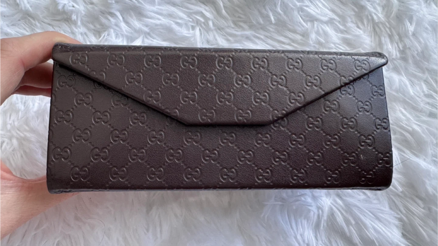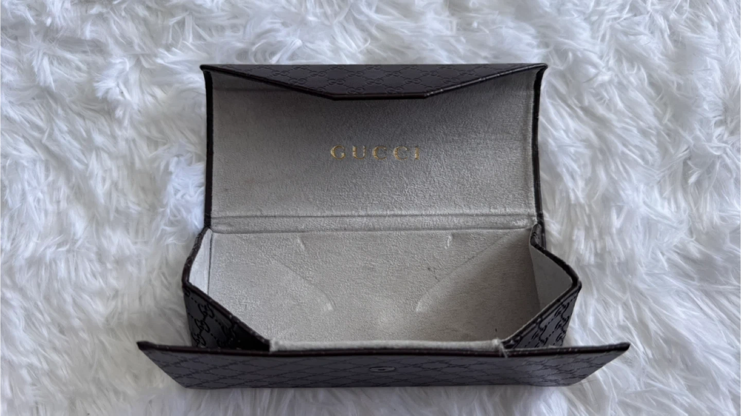 Gucci hard shell glasses case in a rich brown hue. Features the iconic GG monogram embossed throughout. It's perfect for protecting your sunglasses or eyeglasses in style!