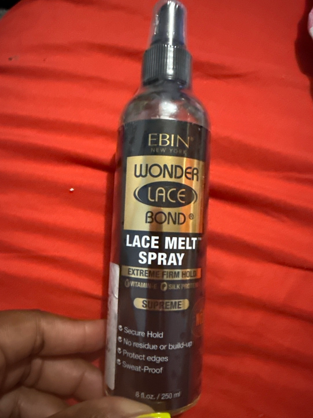 Lace melt spray. Extreme firm hold. Contains vitamin E and silk protein. Provides secure hold, protects edges, sweat-proof, and leaves no residue.
