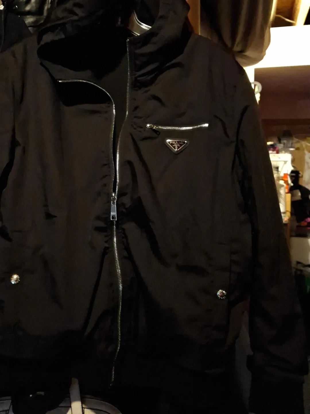This is a stylish black Prada jacket featuring a zip-up front and a convenient chest pocket. It also includes a hood for added versatility. Made from durable material, it's ready for everyday wear.