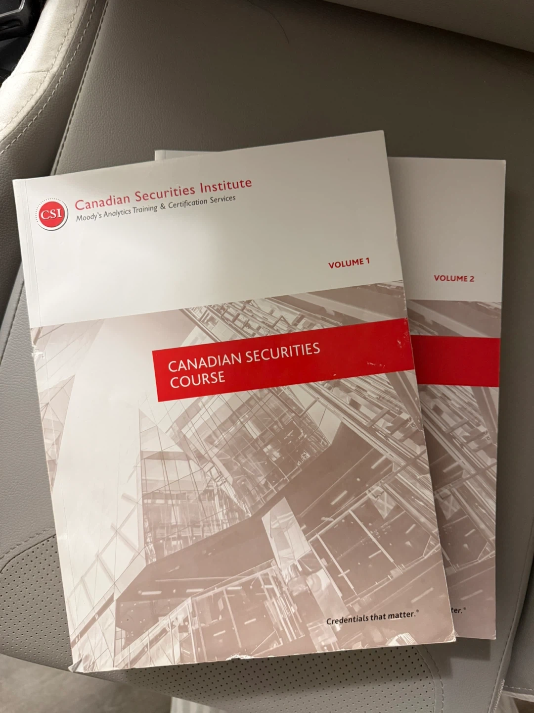 Selling the Canadian Securities Course volumes 1 and 2 from the Canadian Securities Institute. These are great if you're looking to get your credentials!