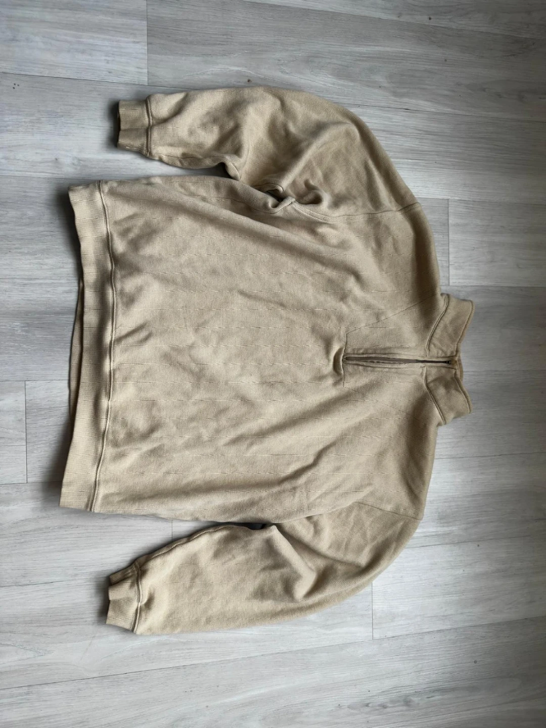 Cozy Aureus quarter-zip pullover in a neutral beige colour! It's in great condition and perfect for layering or just lounging around. The subtle design and comfortable fit make it a versatile addition to any wardrobe