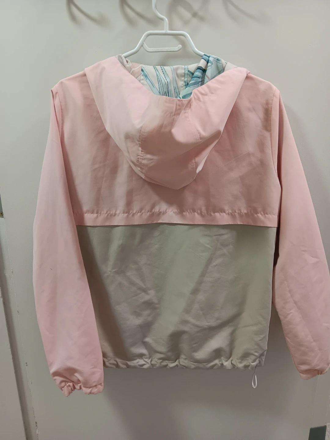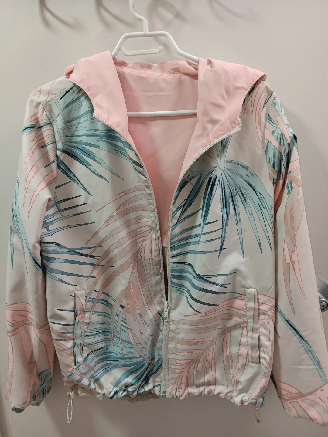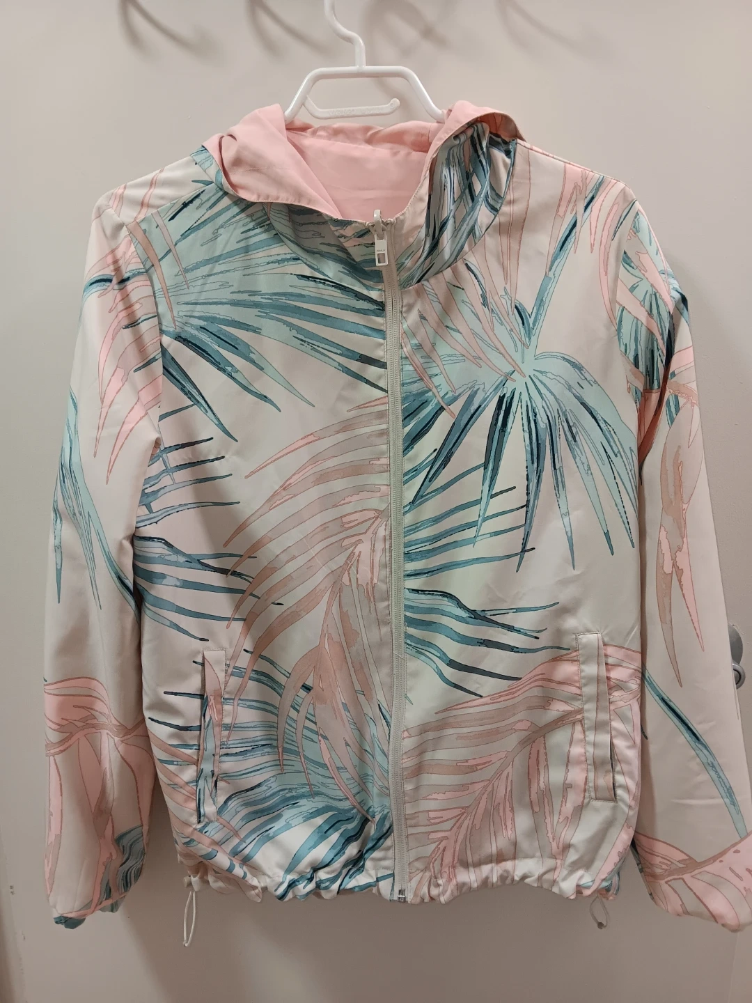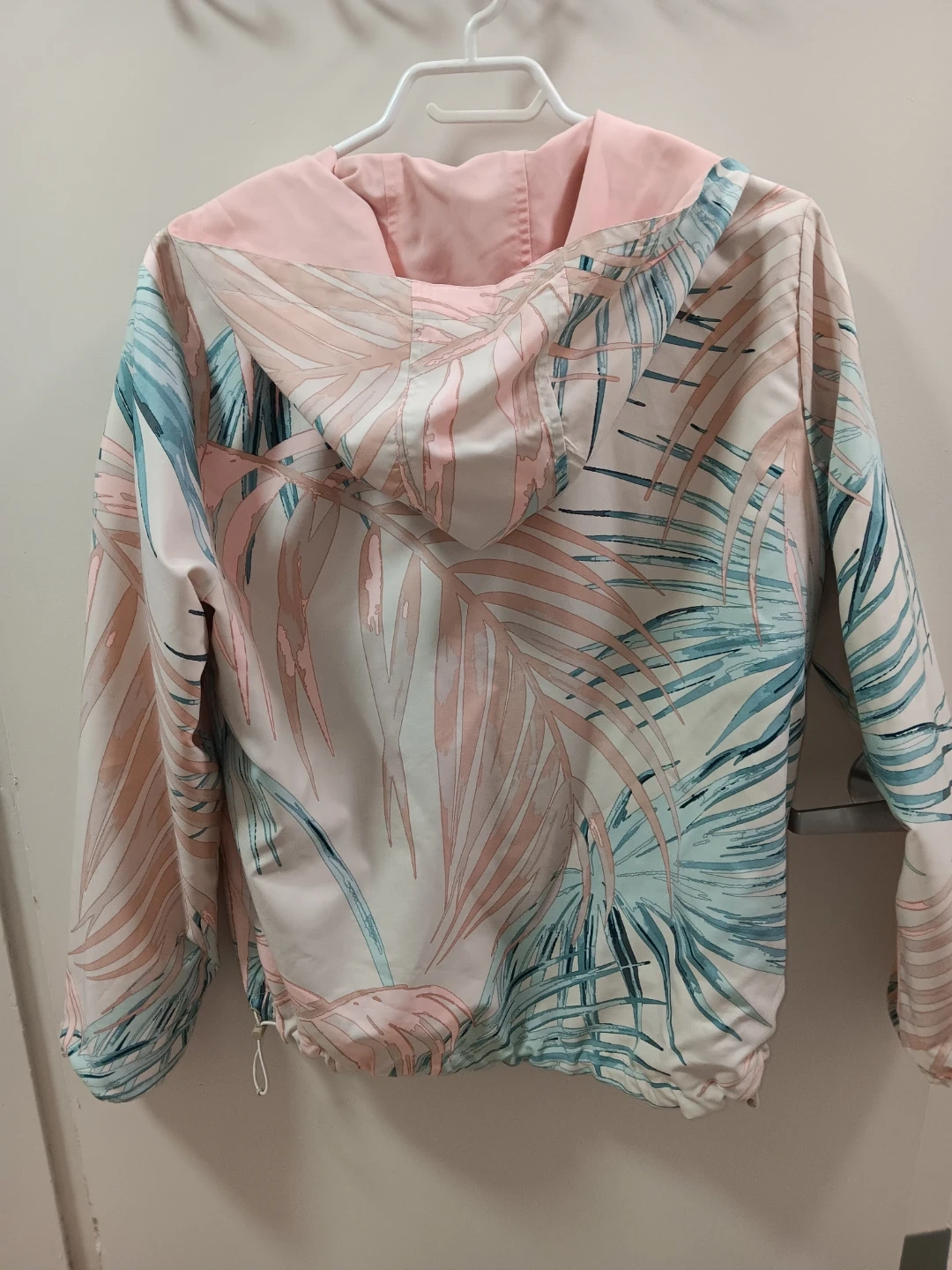 This reversible hooded jacket features a pink and grey colour-block design on one side and a vibrant tropical leaf print on the other. It's lightweight and perfect for breezy days! Features a full zip closure and adjustable drawstring hem. BNWOT and is in pristine condition. Size XL or an intentionally loose fitting size Large!