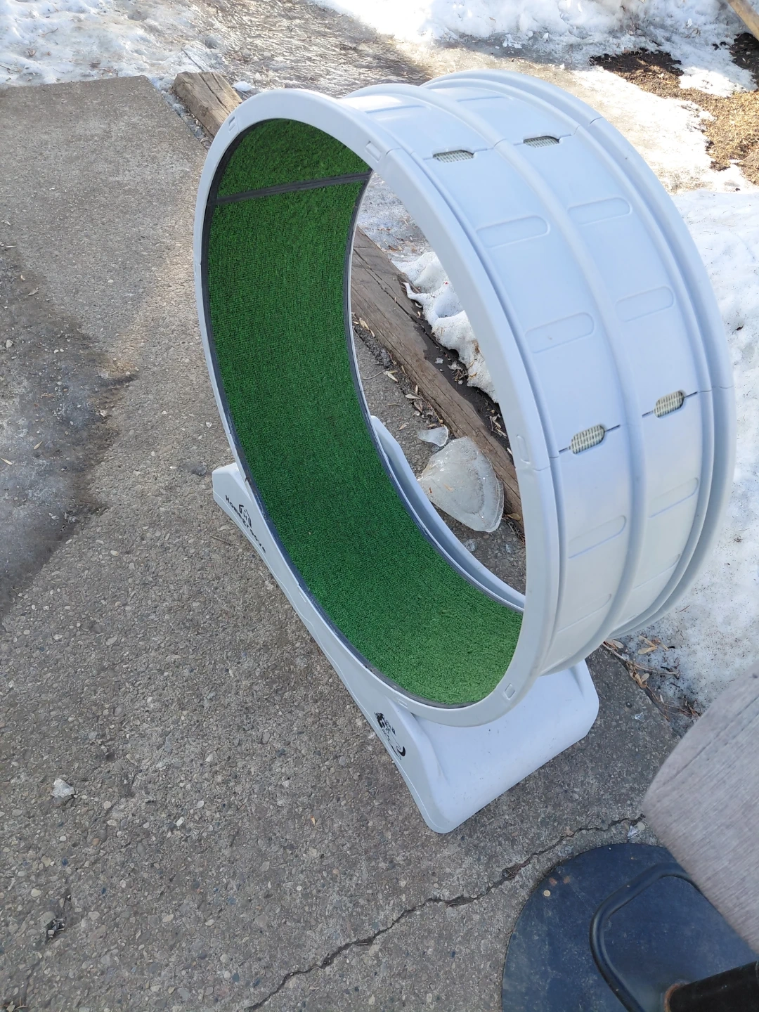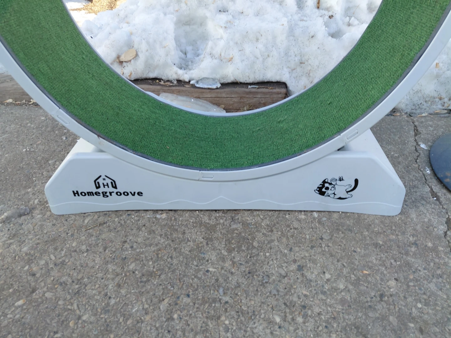 This Homegroove cat running wheel offers a great way for your feline friend to get exercise. It's designed with a sturdy base and a carpeted interior surface for traction. Cats can use it to run and play!
