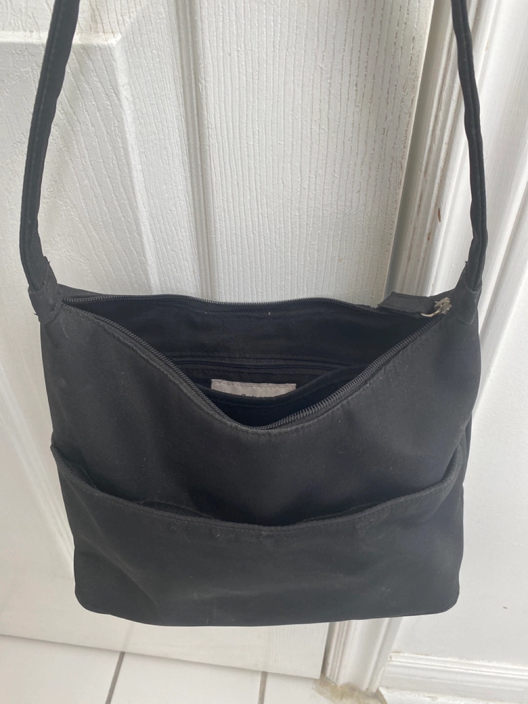 A simple black shoulder bag, perfect for everyday use! It has a zippered top and an outside pocket for easy access to your essentials. Inside is divided into two sections, plus a smaller compartment with a zipper.