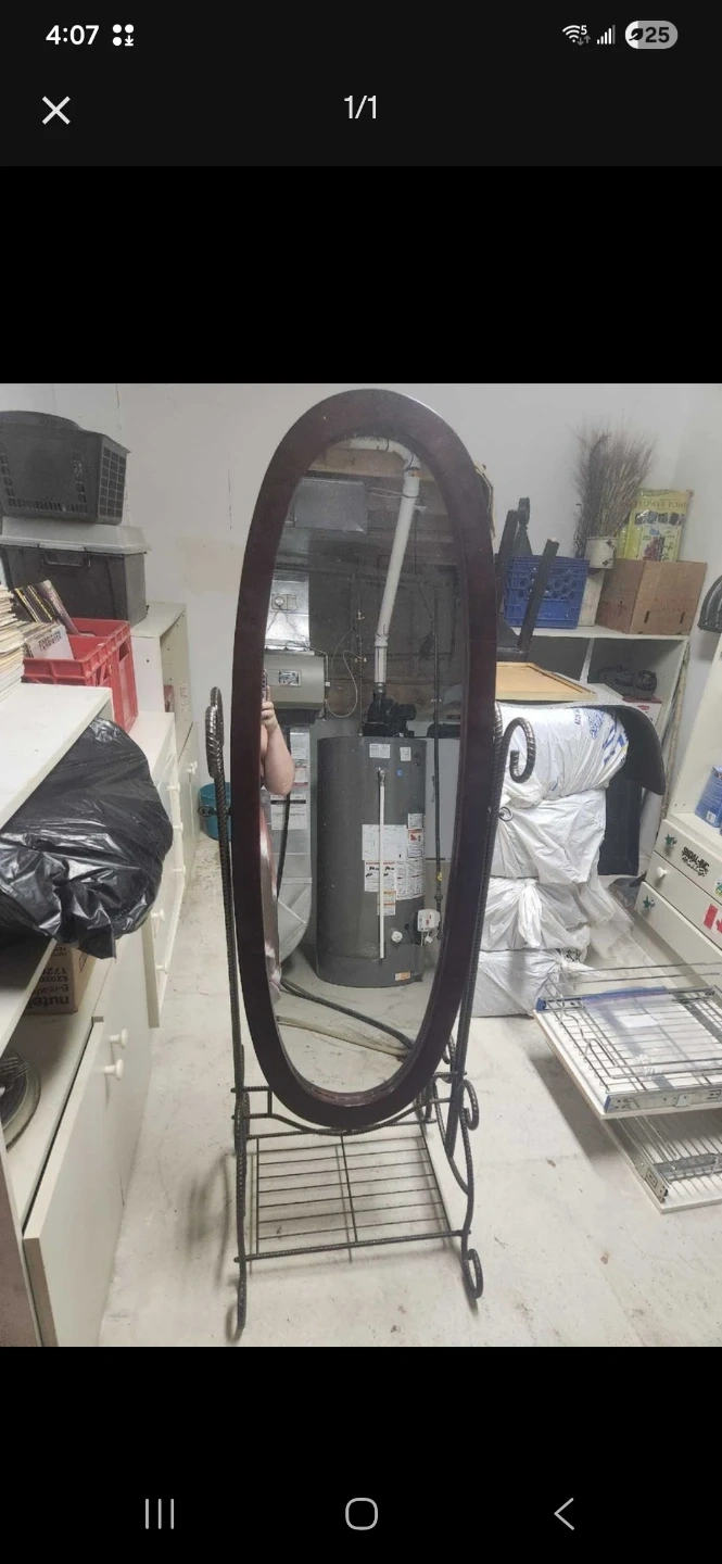 Stand up adjustable mirror, excellent condition with wrought iron base and oval wooden frame. Also bottom storage. No current spot for it in home. Available for pick up in Maple. Great price, non negotiable.