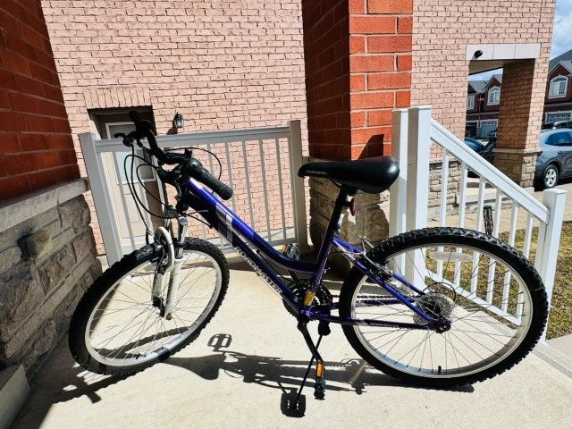 This Roadmaster mountain bike is perfect for leisurely rides, featuring a sturdy frame and comfortable seat. This bike is used and has some cosmetic wear, but it is still in good working condition, ready for trails or city streets. Frame Size: Medium, Wheel Size: 24 inches.