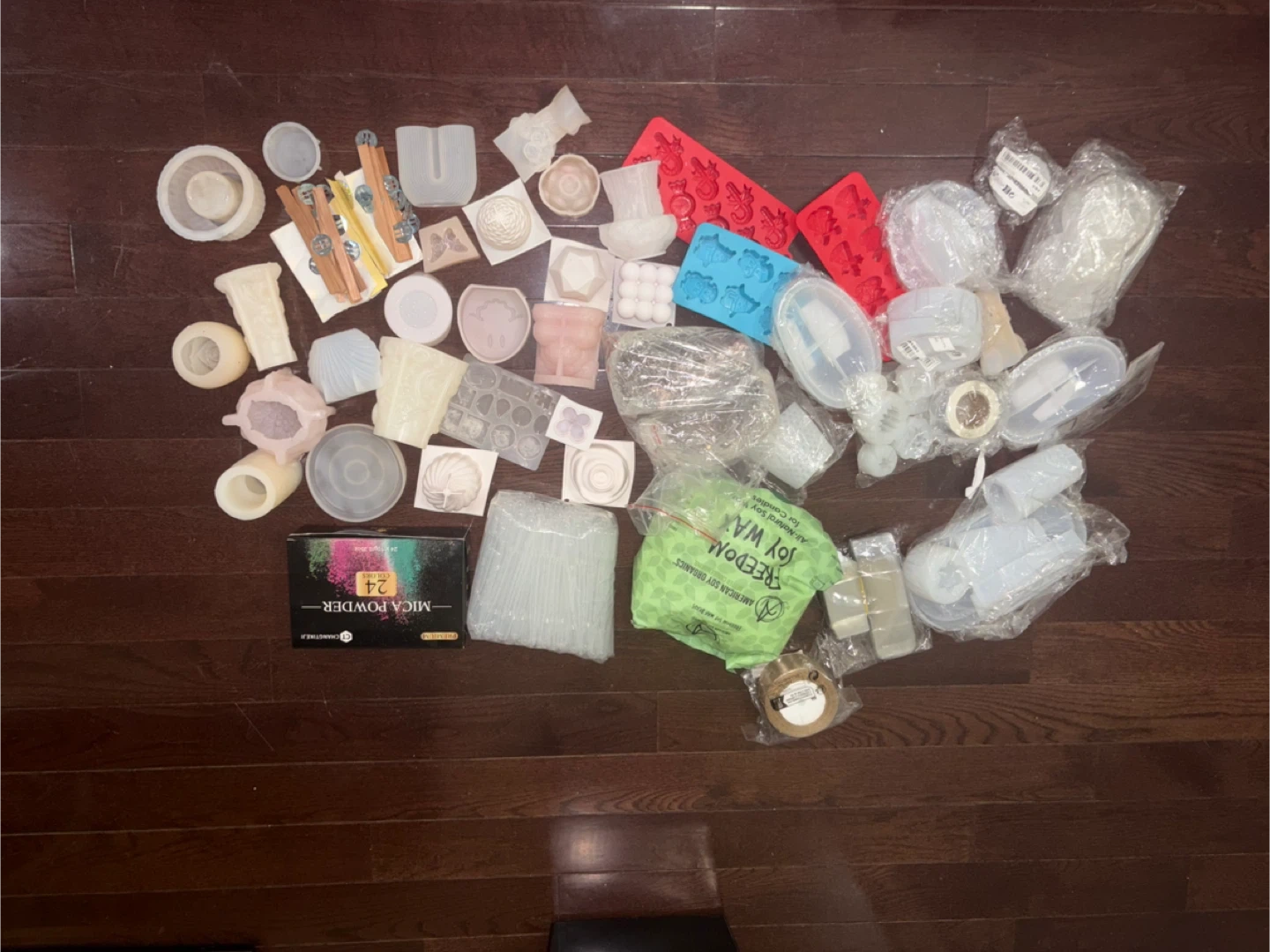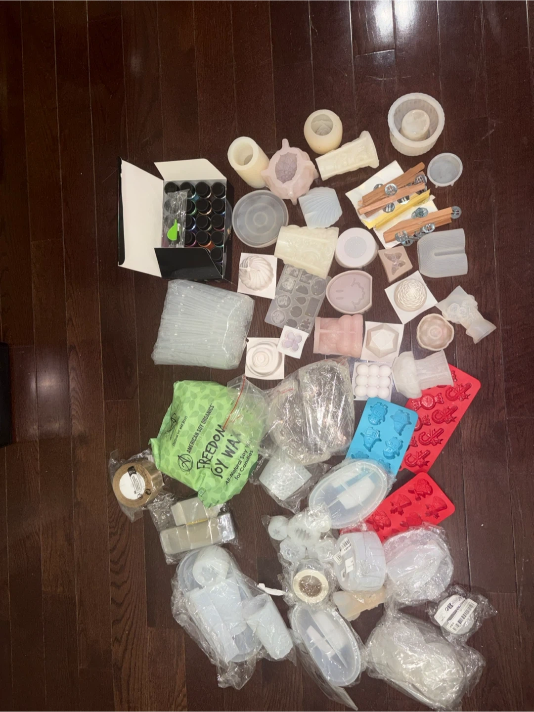 This is a large lot of candle making supplies. It includes wax, various fragrance oils, wicks, molds, and coloring agents. You'll also find a melting pot, scale, and starter tools. Everything you need to begin making candles is here!