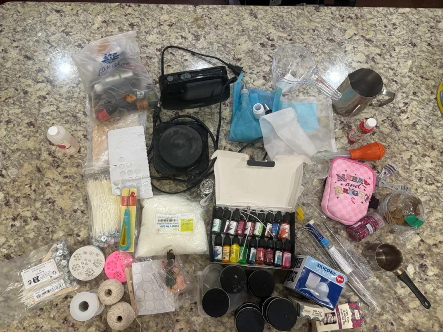 This is a large lot of candle making supplies. It includes wax, various fragrance oils, wicks, molds, and coloring agents. You'll also find a melting pot, scale, and starter tools. Everything you need to begin making candles is here!