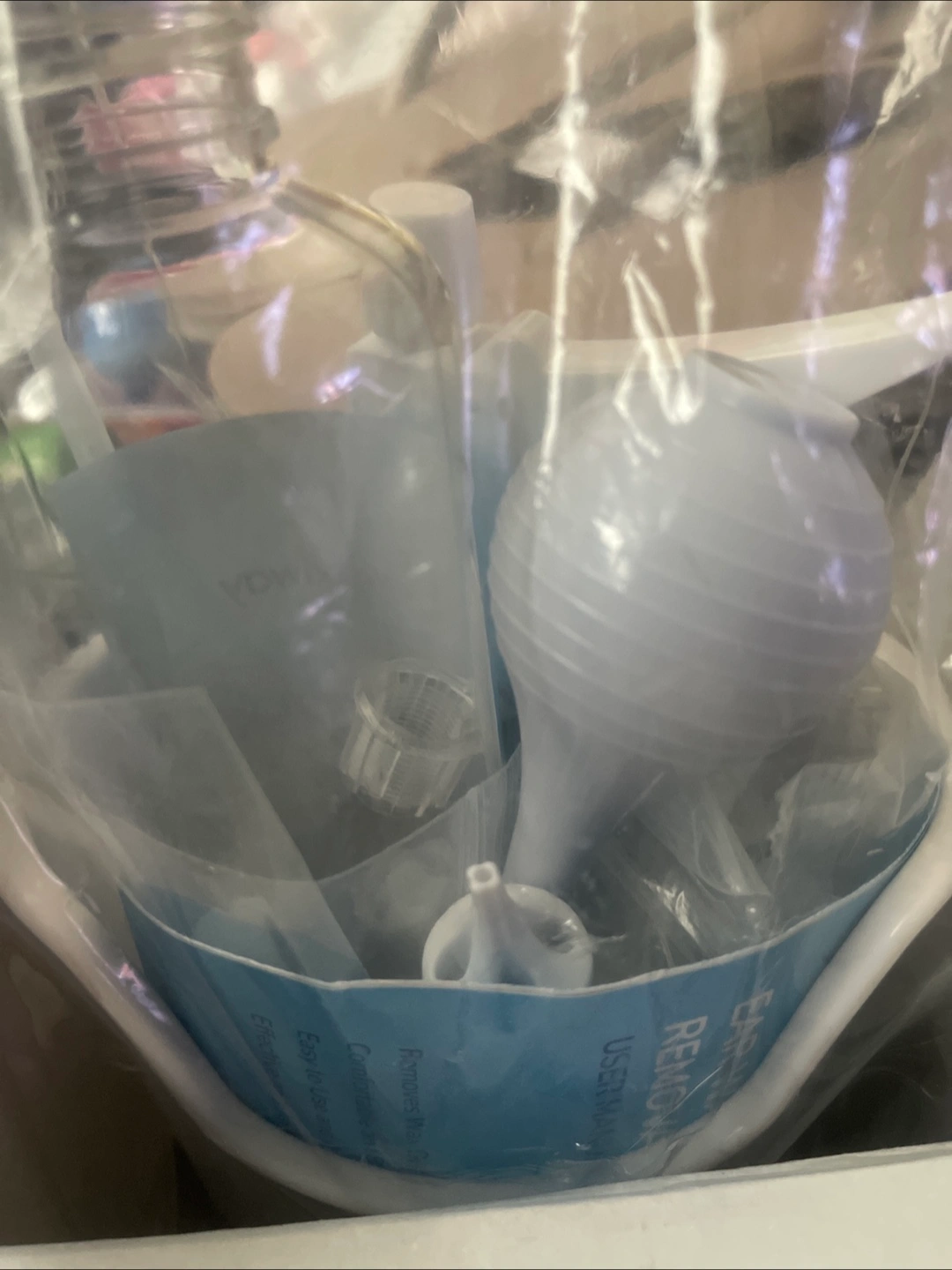 A complete kit including a container, spray applicator, and bulb syringe. The box also contains additional accessories. This can be a relaxing self-care tool to help improve your hearing health.