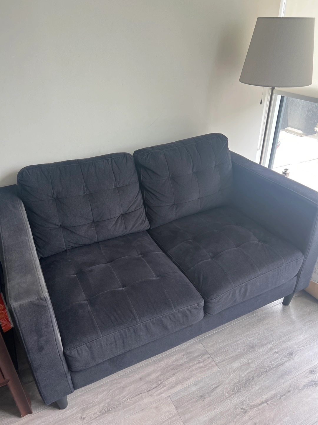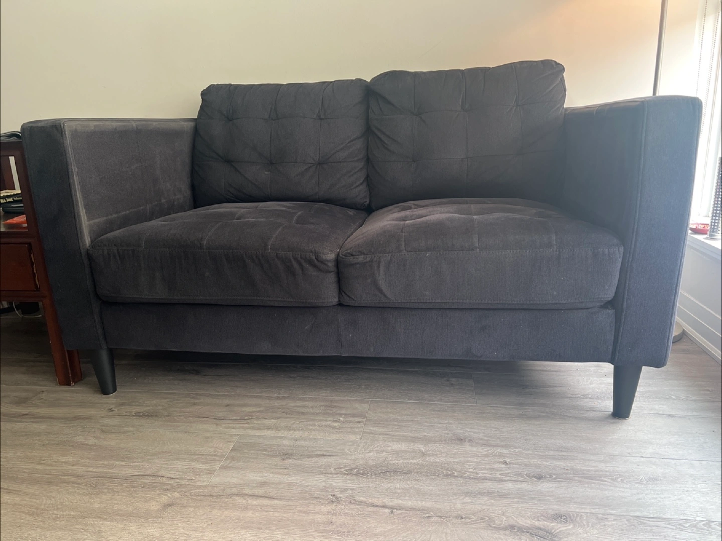 Soft black fabric loveseat. Features a simple design with black legs. Was bought new in 2024
