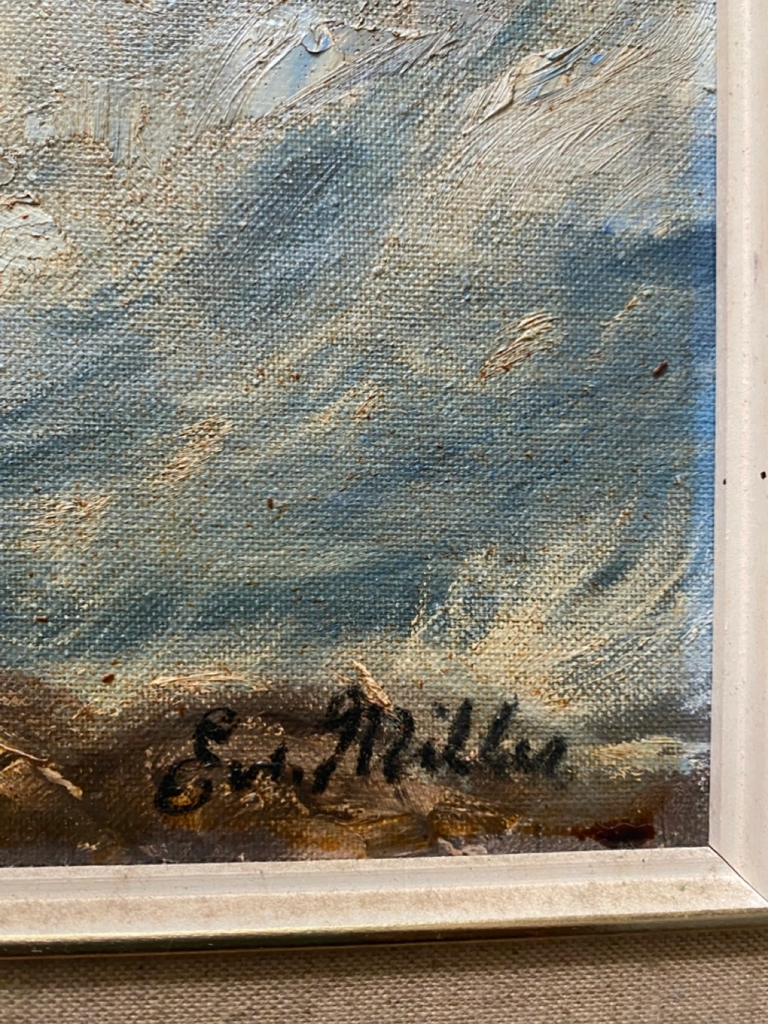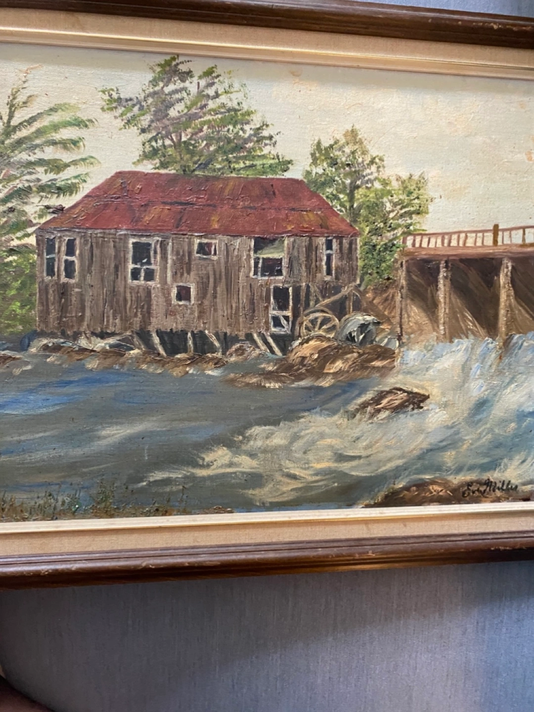 A charming, framed oil painting. Depicts a tranquil waterscape of a mill. A cozy piece of art to bring peace into your home. I’m not sure of the painters first name or if this painting is worth more than $45 but willing to let it go for $20.