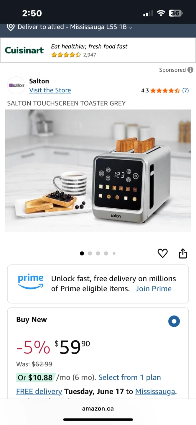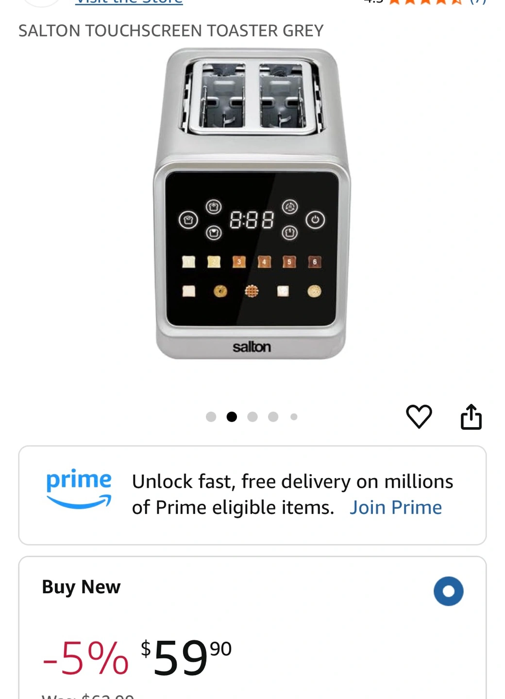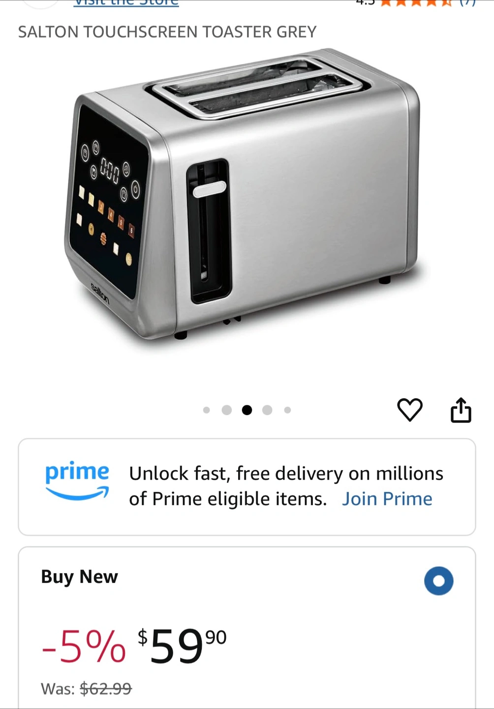 Grey Salton touchscreen toaster, looks great on any countertop. Offers settings for bread, bagels, English muffins, waffles, and pastries. Select from 6 precise shade settings and memory settings as well. Having a perfectly toasted bagel is a good way to start a calm morning. amazon 60$+tax selling only 25$