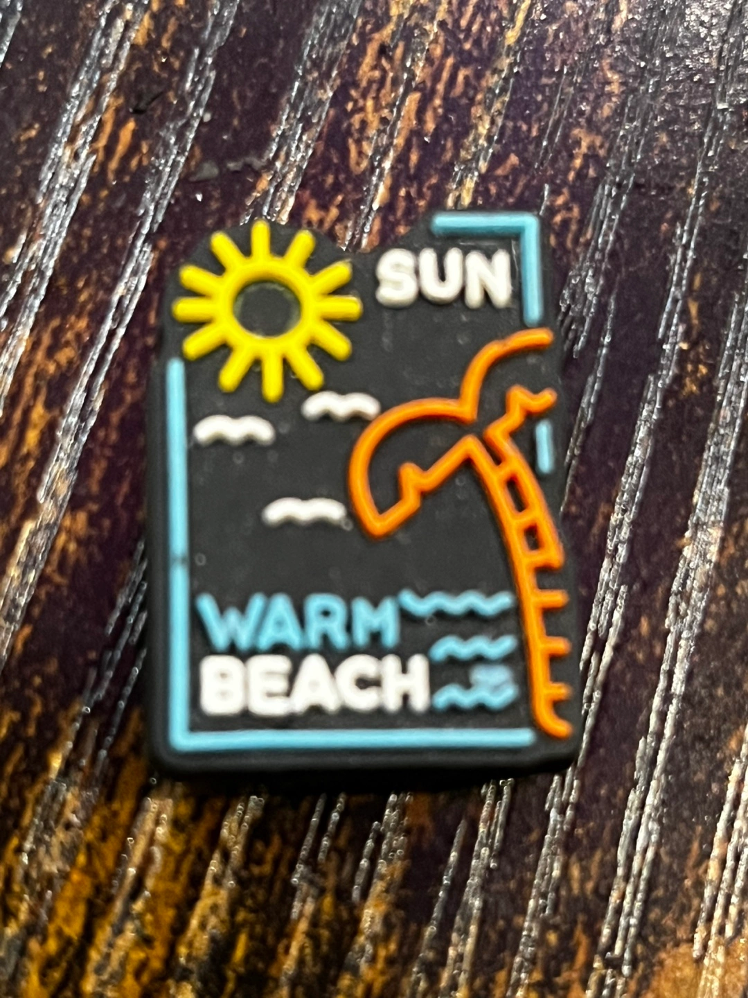 Features an image of a sun, a palm tree, and the words "Warm Beach". You can use it to decorate your favorite footwear, which will make you happy every day.