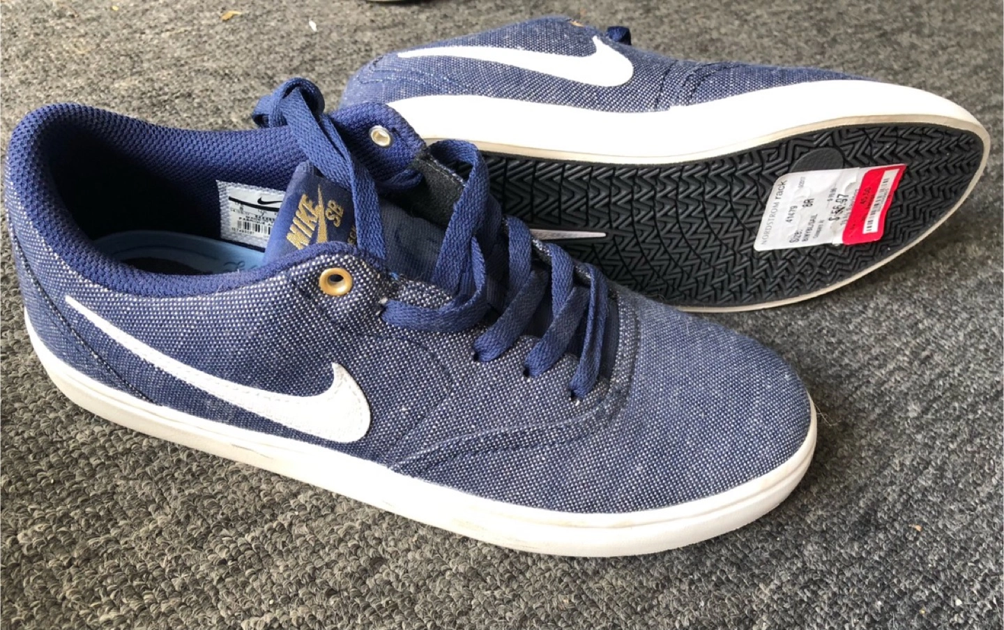Blue canvas sneakers with white soles. White Nike swoosh on the sides. Laces, eyelets, and padded collar. You could wear these to relax and unwind after a long day.