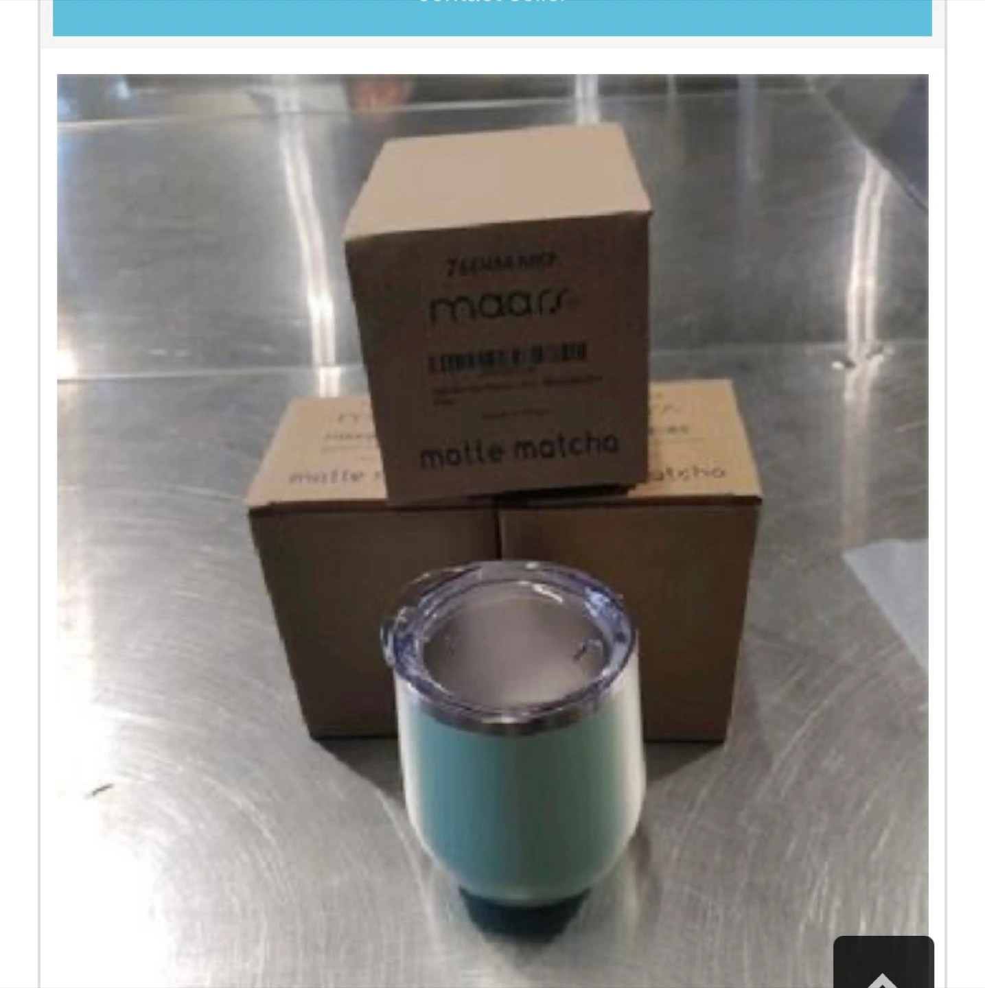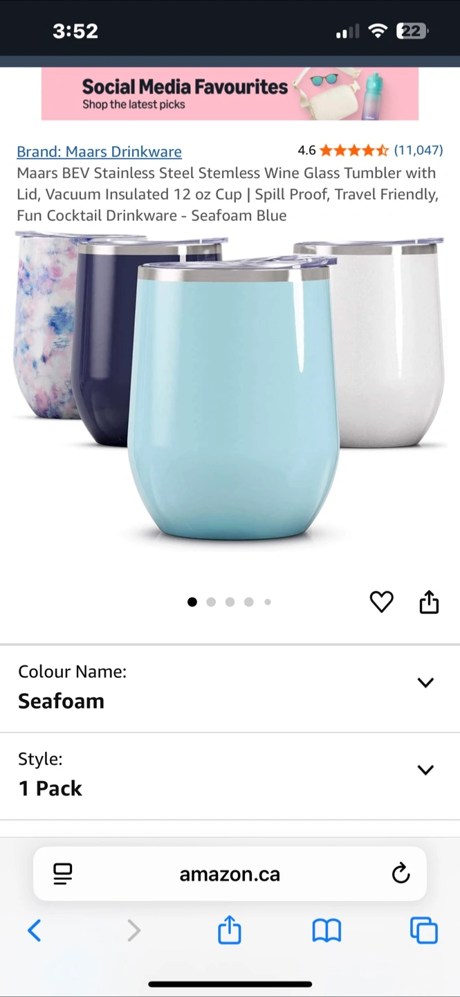 A stainless steel tumbler with a lid. The tumbler has a seafoam colour. You could bring this with you to any destination to savour your favorite beverage.12oz matte matcha tumbler with vacuum-insulted lid Amazon price 30$