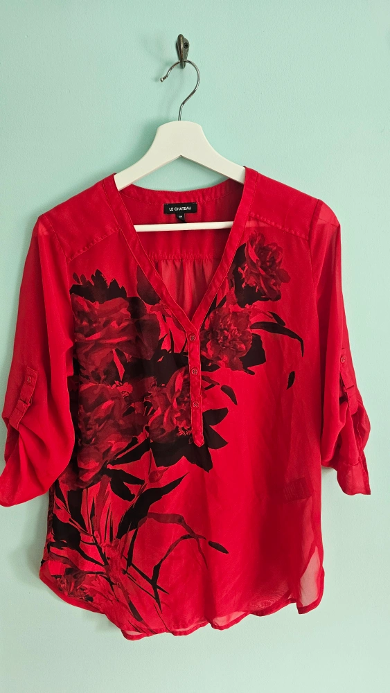 Red blouse with black floral details. Half sleeves with button detailing. V-neckline with button-up closure. Perfect for a relaxing day out.