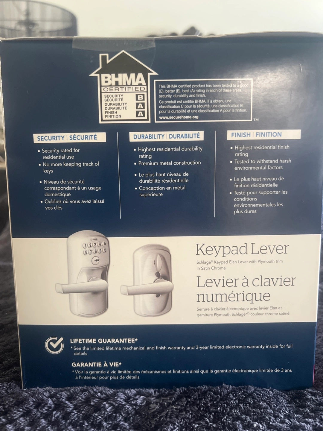 The box has a keypad lever. The box also features a lifetime guarantee. This item can provide a sense of security and peace of mind.